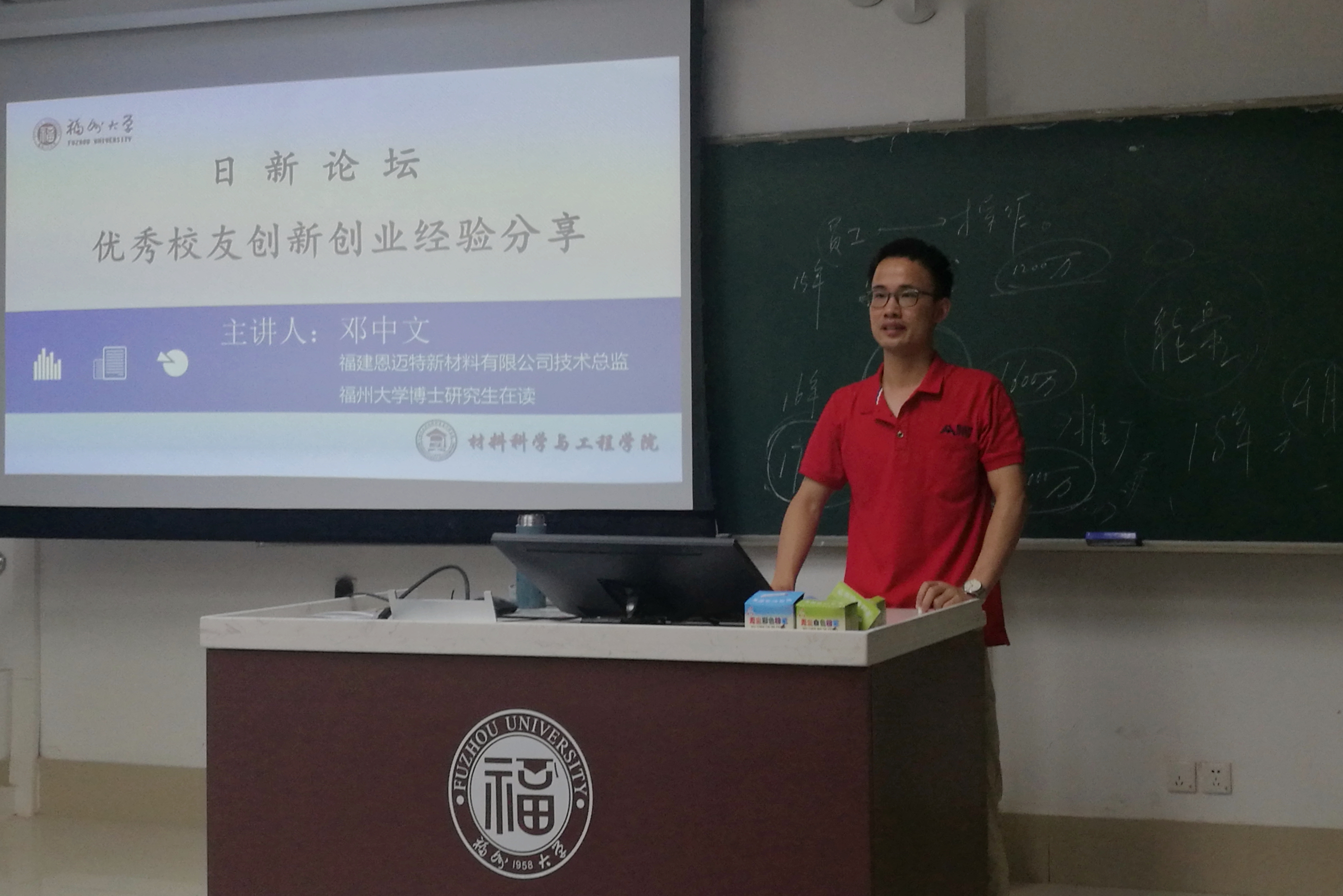 优秀校友创新创业经验分享会于西二-207顺利举行。讲座邀请到福建恩迈特新材料有限公司技术总监邓中文校友为同学们做出分享。分享会由高分子材料专业系主任吕秋丰老师主持。