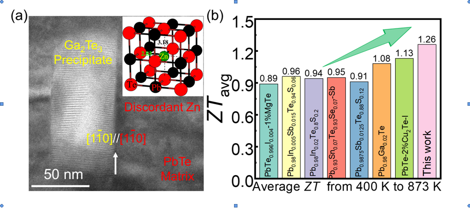 图1. 图(a)所示晶体结构和微观结构,偏心Zn合金化在PbTe基体中析出共格Ga2Te3纳米相,并伴随大量Te空位的形成,极大的提高了Ga掺杂n型PbTe载流子浓度和电导率。图(b)所示与其他性能较优的n型PbTe热电材料的相比较,有效提高了ZTavg。