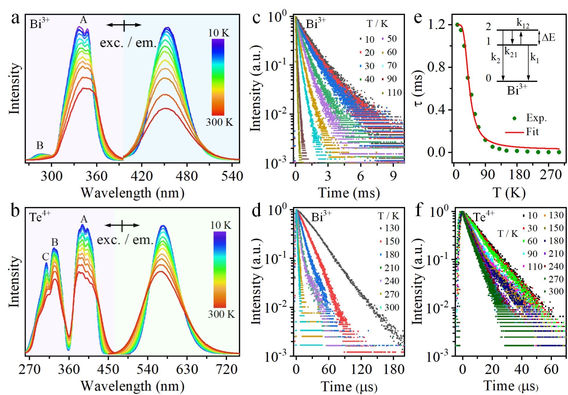 图3、(a) Cs2SnCl6: 1.1%Bi3+微晶的变温激发(λem = 456 nm)和发射(λex = 347 nm)光谱;(b) Cs2SnCl6: 5.6%Te4+微晶的变温激发(λem = 565 nm)和发射(λex = 382 nm) 光谱;(c,d) Cs2SnCl6: 1.1%Bi3+的变温荧光衰减曲线(λem = 456 nm);(e) Bi3+的荧光寿命随温度变化关系及三能级模型;(f) Cs2SnCl6:
