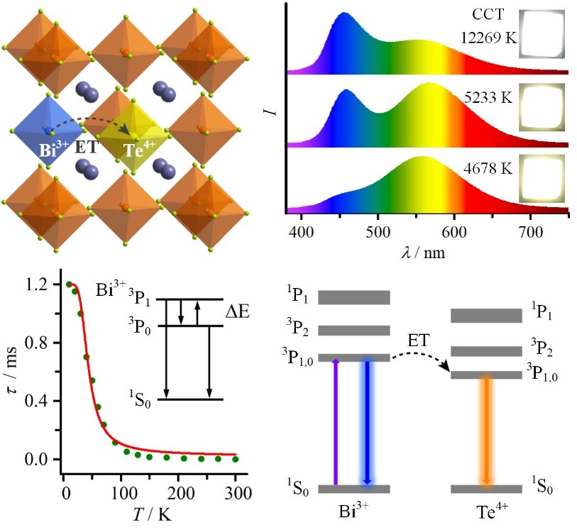图1、基于Bi3+/Te4+共掺杂Cs2SnCl6微晶实现双带可调谐白光发射:晶体结构示意图、发射光谱、Bi3+的荧光寿命随温度变化关系曲线、Bi3+→Te4+能量传递示意图。