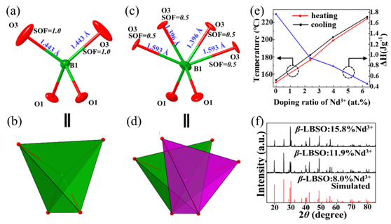 图2.β-LBSO晶体(a, b)与β-LBSO: 8.0%Nd3+晶体(c, d)中BO4四面体的球棍模型与多面体构型图。LBSO: x%Nd3+样品的相变温度与焓变演化结果(e)及β-LBSO: 11.9%Nd3+、β-LBSO: 15.8%Nd3+等高浓度掺杂晶体的粉末X射线衍射图谱(f).