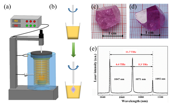图1.晶体生长装置(a)与晶体生长过程示意图(b),室温下的β-LBSO: 8.0%Nd3+ (c)和β-LBSO: 15.8%Nd3+(d)晶体,β-LBSO: 8.0%Nd3+晶体的三波长激光光谱图(e)。