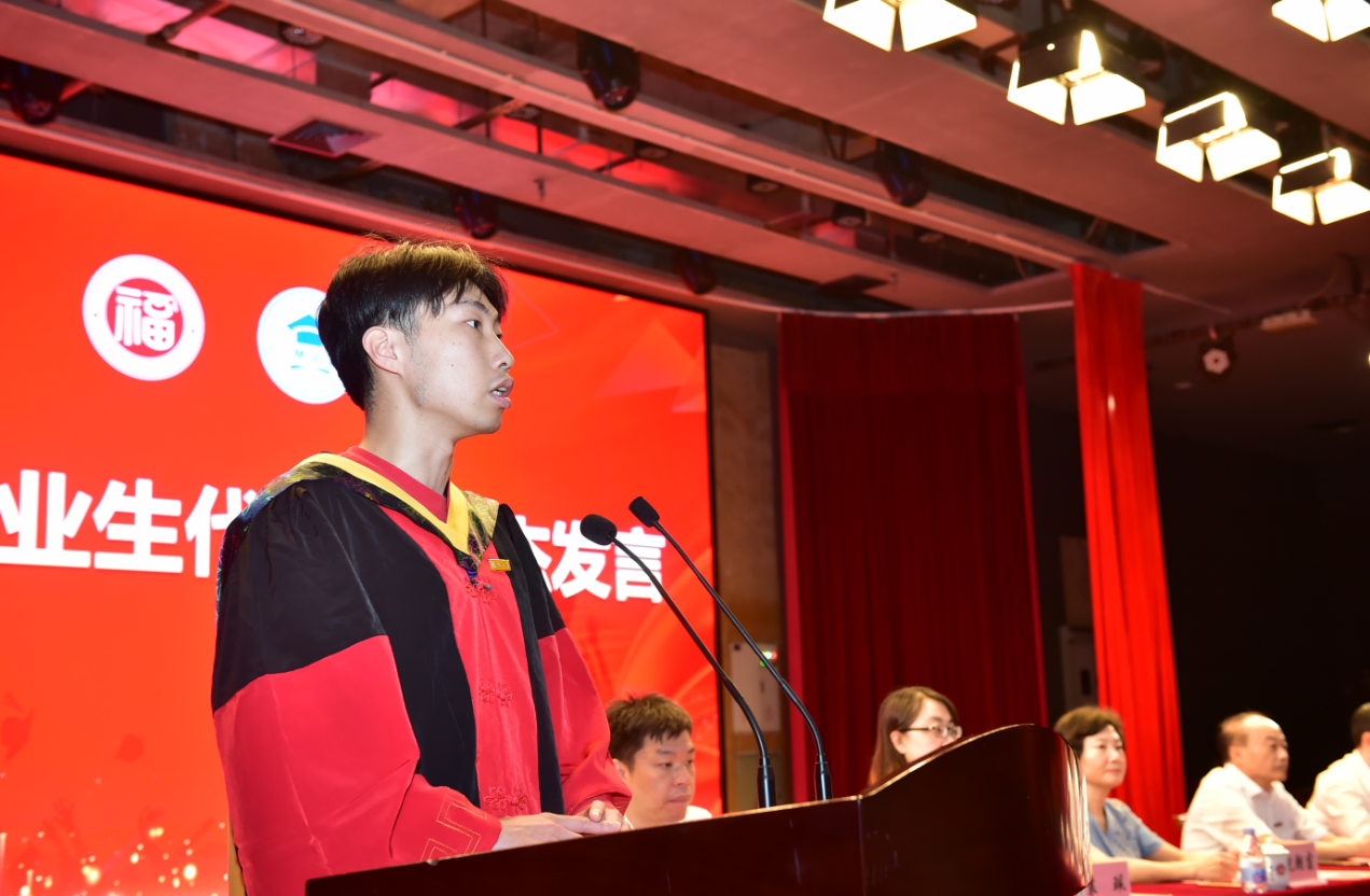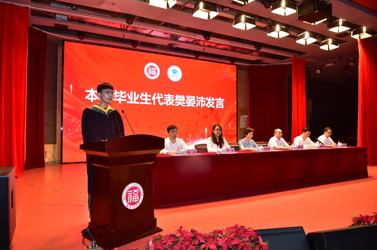 接着,本科毕业生代表、研究生毕业生代表和教师代表依次进行发言。本科毕业生代表樊晏沛同学回忆了四年求学生涯,讲述了探索道路上遇到的困难与应对方法;研究生代表郑伟杰同学回顾了硕博七年求学路,娓娓道来成长路上的付出与收获;教师代表林起浪教授代表全体教师为毕业生送上祝福,希望同学们胸怀理想,志存高远,不忘初心,砥砺前行,不断学习和更新知识,为国家与社会发展做出卓越的贡献。