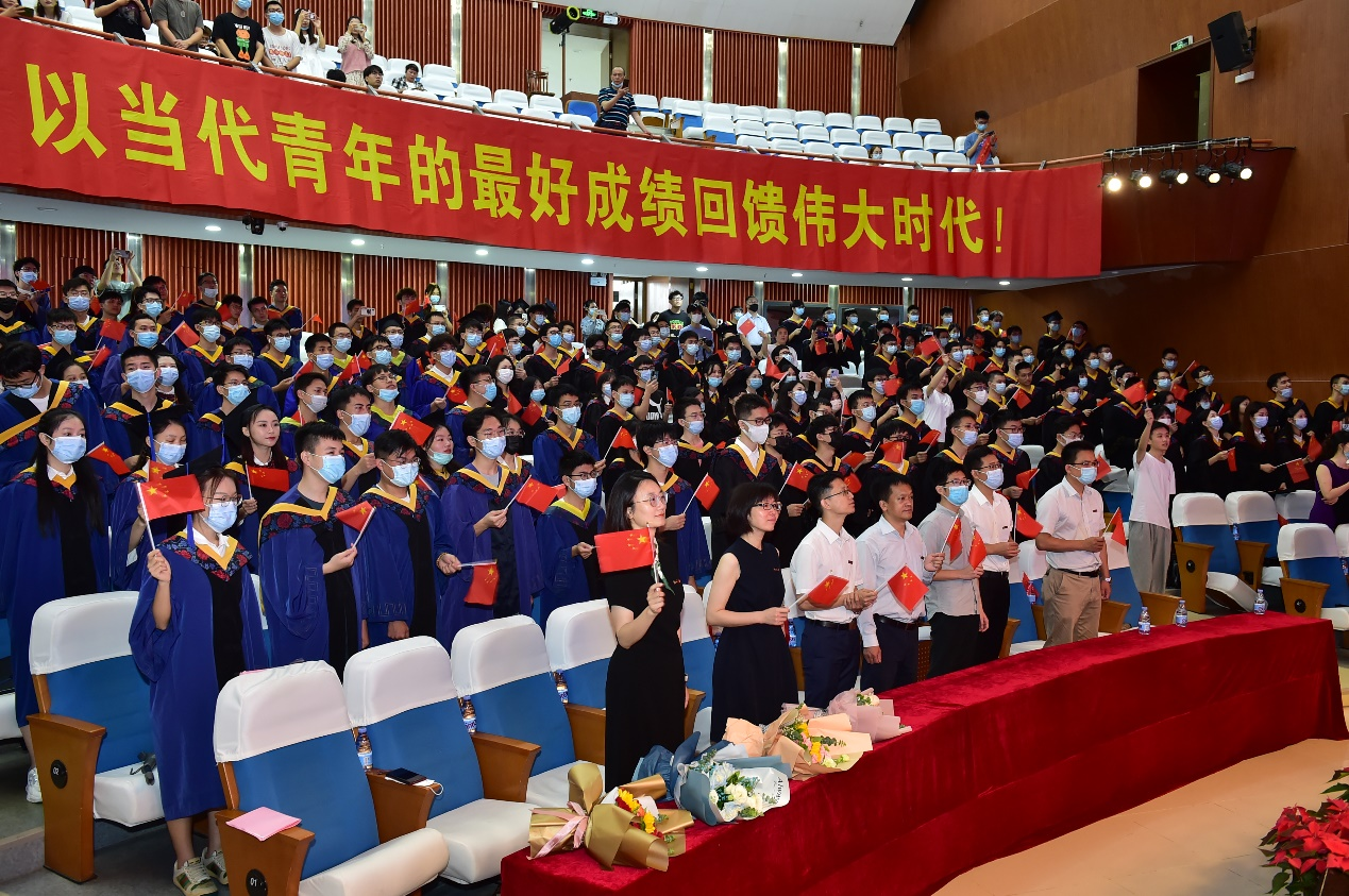 随后,在领唱同学的带领下,全场合唱歌曲《凤凰花开的路口》。现场播放着精心制作的毕业班同学照片合辑,同学们挥舞手中的国旗,眼含热泪,对大学生活进行告别。