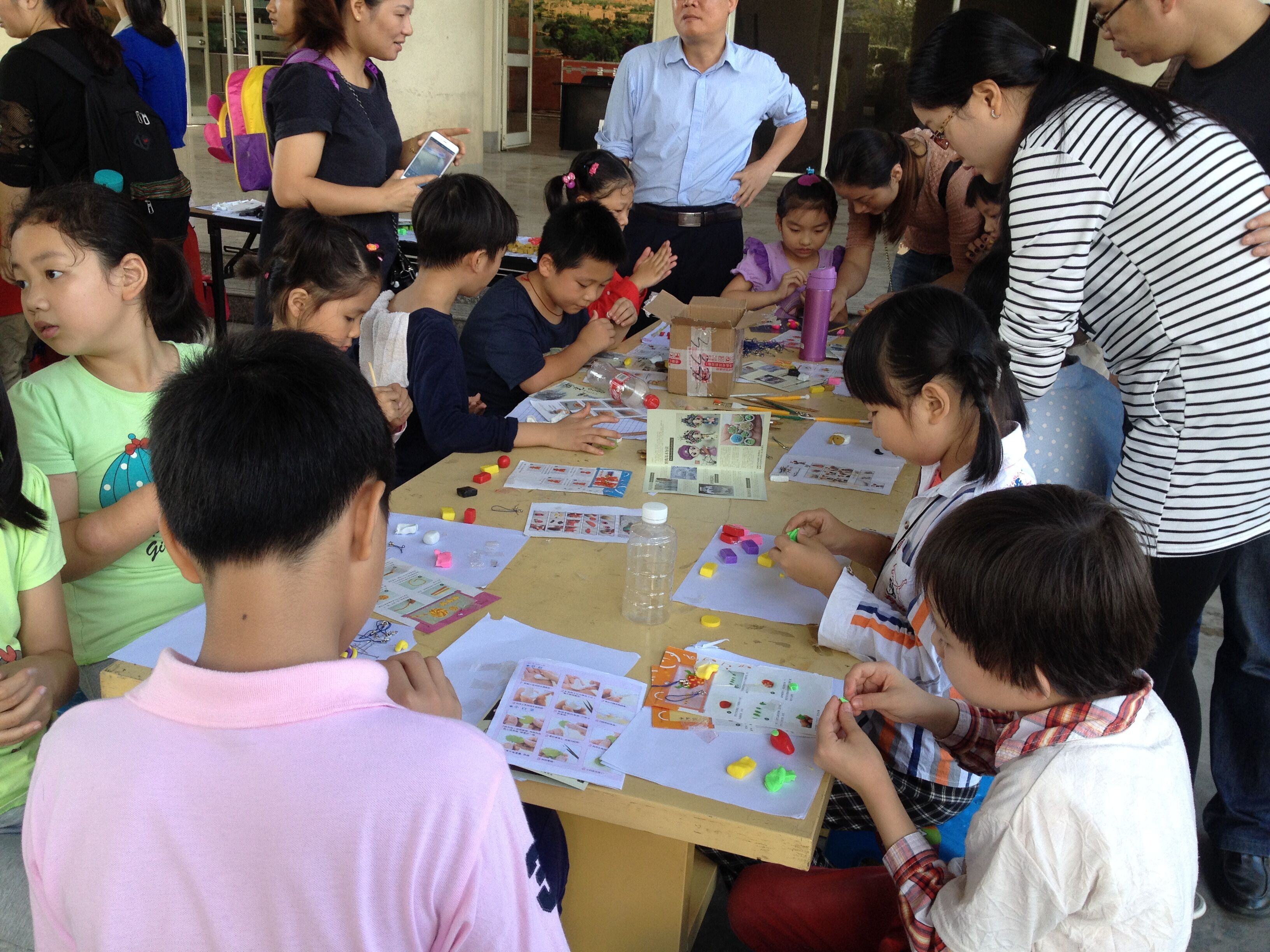 活动在晨光熹微中开始了紧张的准备工作。工作人员首先拉起横幅,摆开桌子,分割软陶,陈列出精美小礼品。活动还未开始,便吸引了路人的一阵阵驻足观看。在一阵忙碌的准备中,一切准备就绪,活动终于拉开了帷幕。工作人员首先向家长和小朋友分发精美宣传单,让家长和小朋友一起阅读宣传单的陶瓷知识。在此过程中,于岩老师还就宣传单里比较专业的知识对家长进行了耐心的解释,使陶瓷知识科普得到了更好的宣传。对于小朋友在宣传单里比较迷茫的内容,工作人员便用直白易懂的话语,使他们懂得了陶瓷的制作过程和我们身边的陶瓷种类等内容。接着工作人员向小朋友提问了宣传单里面的陶瓷基本小知识,在家长和工作人员的教导下,小朋友很快就回答了工作人员的问题,并领取了精美小礼品和软陶DIY体验券。在工作人员的引导下,小朋友领取了软陶DIY所用的原料,并在手工区展开天马行空的想象力开心地玩起了软陶。在小朋友的巧手制作下,一个个可爱活泼的小玩偶小动物诞生了。小朋友们一个个的精美小玩偶赢得了于岩老师的阵阵夸奖。活动结束后,支部成员还邀请于岩老师和小朋友们在横幅上签名留念。