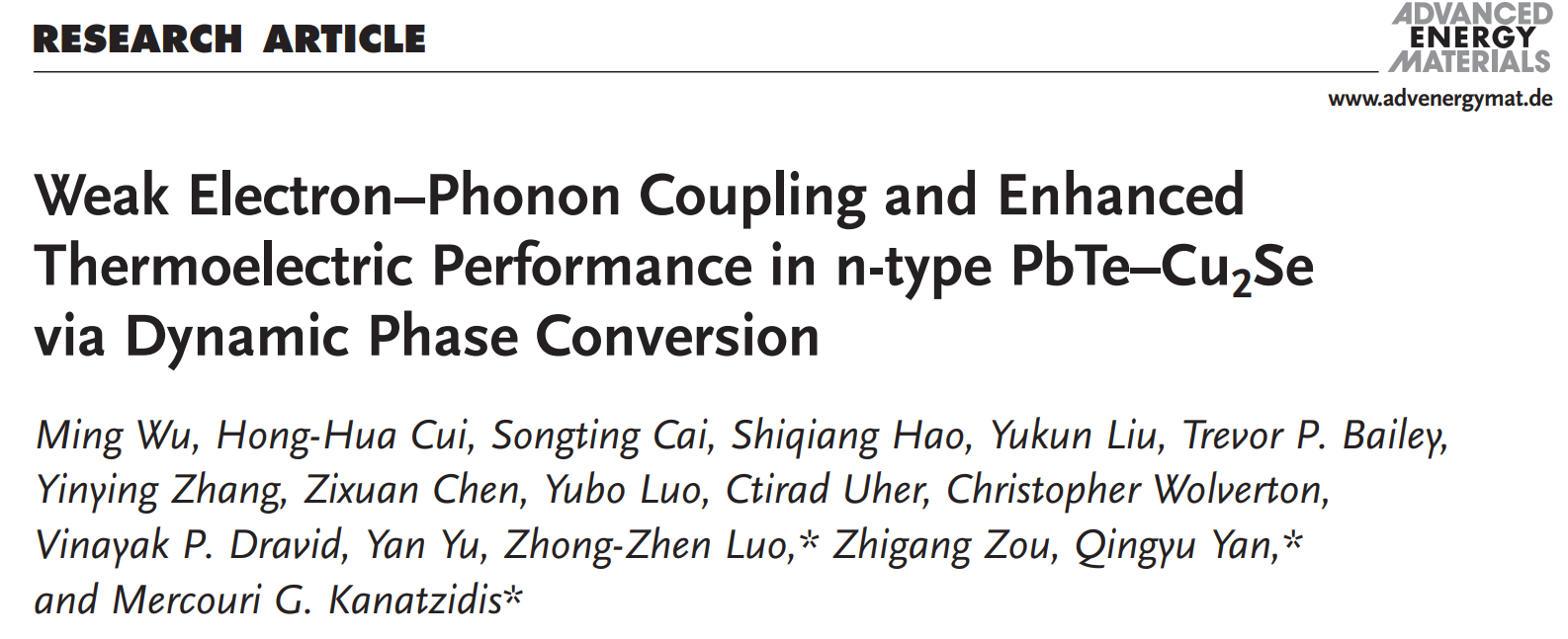 近日,成人影片 罗中箴教授与合作者在N型PbTe热电材料研究方面取得新进展,相关研究结果发表在《Advanced Energy Materials》(中科院SCI一区TOP期刊,影响因子29.698)期刊上。成人影片 热电功能材料实验室(2020年底依托成人影片 成立)博士生吴明为该论文第一作者,论文得到了邹志刚院士、新加坡南洋理工大学颜清宇教授和美国西北大学Mercouri G. Kanatzidis教授的指导,成人影片 为第一通讯单位。
