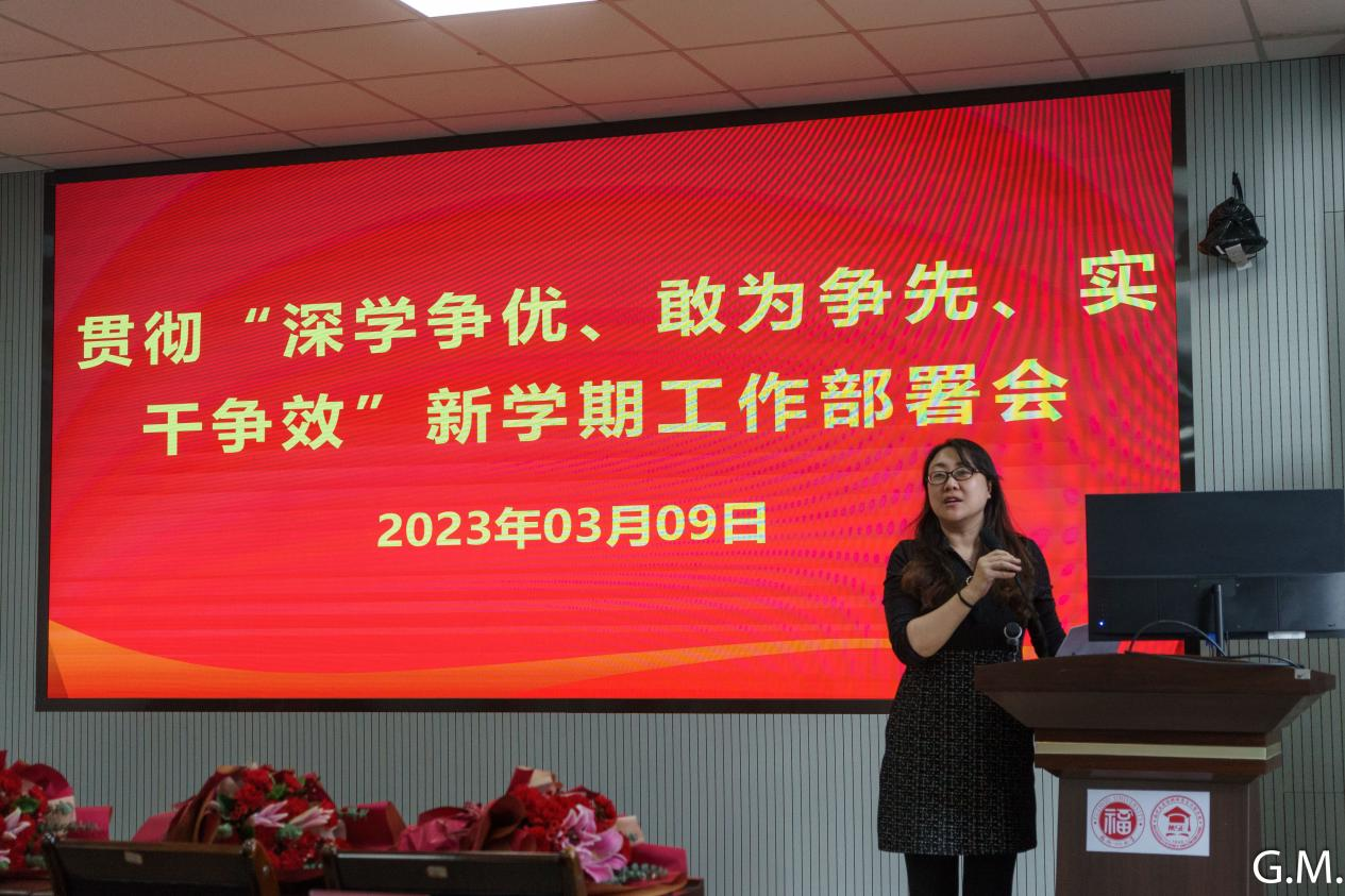 随后,学院开展了“深学争优、敢为争先、实干争效”新学期工作部署会。全体院领导就分管工作等方面进行深入阐述,并完成新学期的工作部署。院党委倪朝霞书记要求,全院教职工要深入学习贯彻党的二十大精神,认真落实校党委关于实施“深学争优、敢为争先、实干争效”行动部署,脚踏实地,埋头苦干,不折不扣完成各项重点工作和全年目标任务,加快推进学校“双一流”建设。