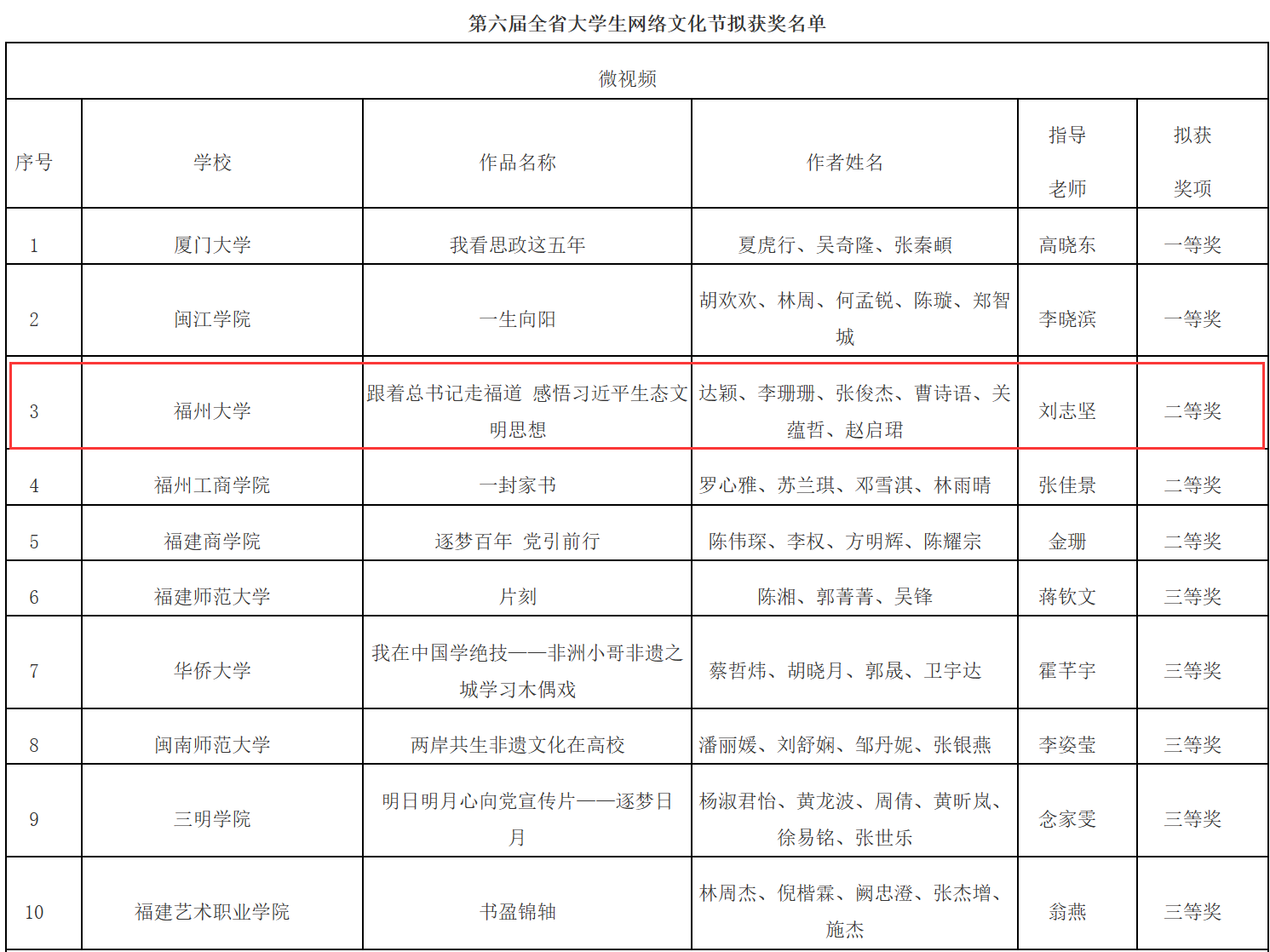 根据《关于第六届全省大学生网络文化节和全省高校网络教育优秀作品推选展示活动拟获奖结果的公示》,成人影片 微视频作品《跟着总书记走福道 感悟习近平生态文明思想》荣获二等奖,特此祝贺!
