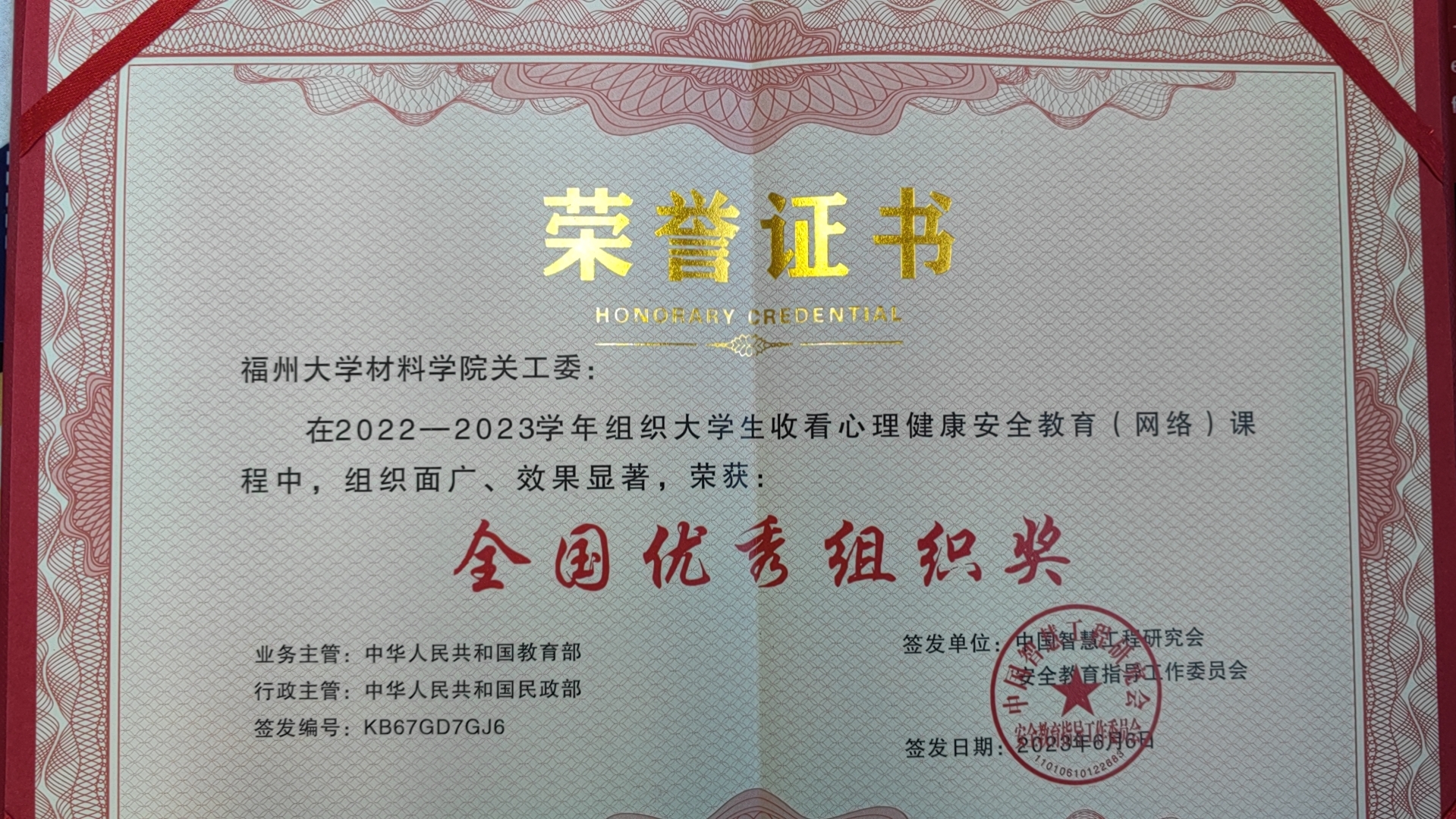 经中华人民共和国教育部和中华人民共和国民政部评审,成人影片 关工委在2022-2023学年组织大学生收看心理健康安全教育(网络)课程中,组织面广、效果显著,荣获全国优秀组织奖,特此祝贺。
