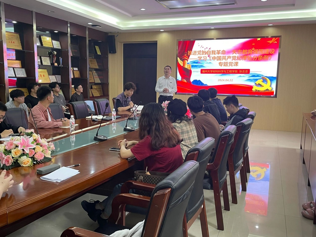 4月22日,成人影片 召开院领导上党课暨主题党日《中国共产党纪律处分条例》(简称《条例》)学习会。会上,学院党委副书记张志忠为2021级本科生党支部和2020级博士研究生党支部讲授推进党的自我革命,矢志教育强国建设——学习《中国共产党纪律处分条例》专题党课。