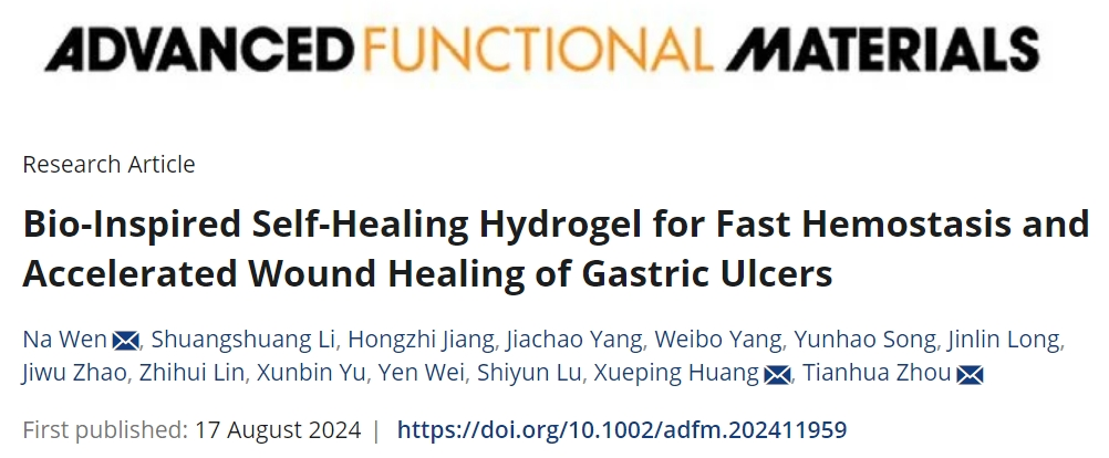 胃溃疡是一种全球性常见的消化系统疾病,临床上伴随急性或慢性出血的胃溃疡严重威胁患者生命,调查显示,成年人每年胃溃疡的发病率为10%-20%。伴有急性或慢性出血的胃溃疡有很大的致命风险。然而,如何在胃溃疡出血时实现快速止血和伤口愈合,是一项艰巨的挑战。目前的临床治疗方法包括质子泵抑制剂和胃黏膜保护剂等,但其效果均不尽如人意,为了应对这一挑战,近日,成人影片 温娜与附属省立医院黄雪平、联合中国科学院物构所周天华研究员等人,受人体内源性防御机制的启发,以凝血酶衍生的C末端肽(TCP-25)作为靶向因子,并通过Schiff碱反应将其结合到两种新型可注射且生物相容的羧甲基壳聚糖(CMCs)基水凝胶中,设计开发了两种新型仿生TCP-25肽水凝胶。该TCP-25肽水凝胶实现了对急性或慢性胃溃疡出血的快速止血和创面愈合,显示出良好的临床应用前景。相关工作以“Bio-Inspired Self-Healing Hydrogel for Fast Hemostasis and Accelerated Wound Healing of Gastric Ulcers”为题发表在《Advanced Functional Materials》上(Adv. Funct. Mater. 2024, 2411959)。