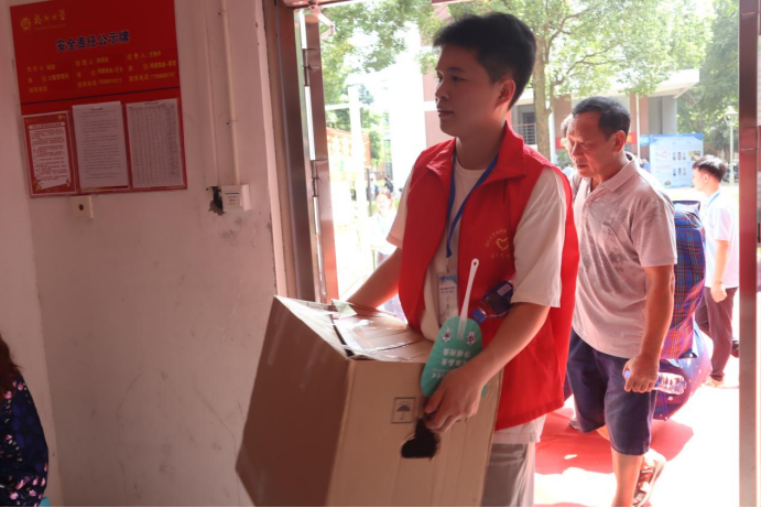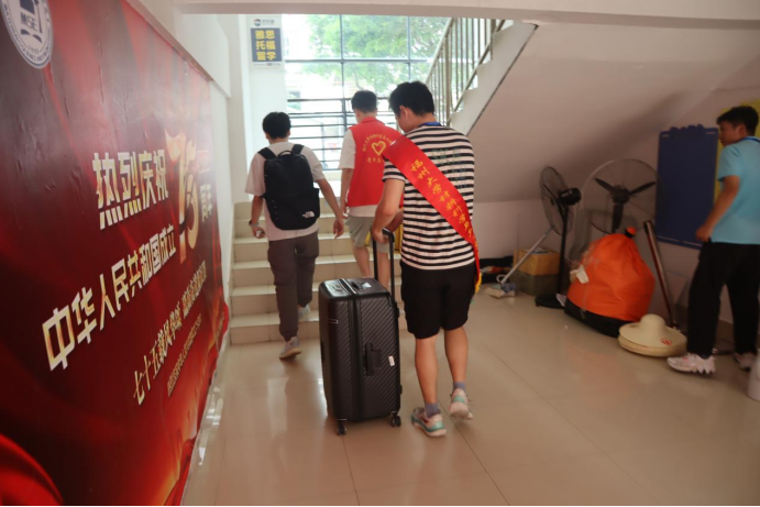 志愿者手拿指示牌,为不熟悉校园环境的新生和家长指引道路,为行李繁重的新生搬运行李。