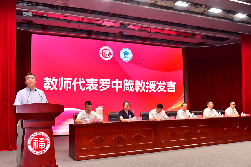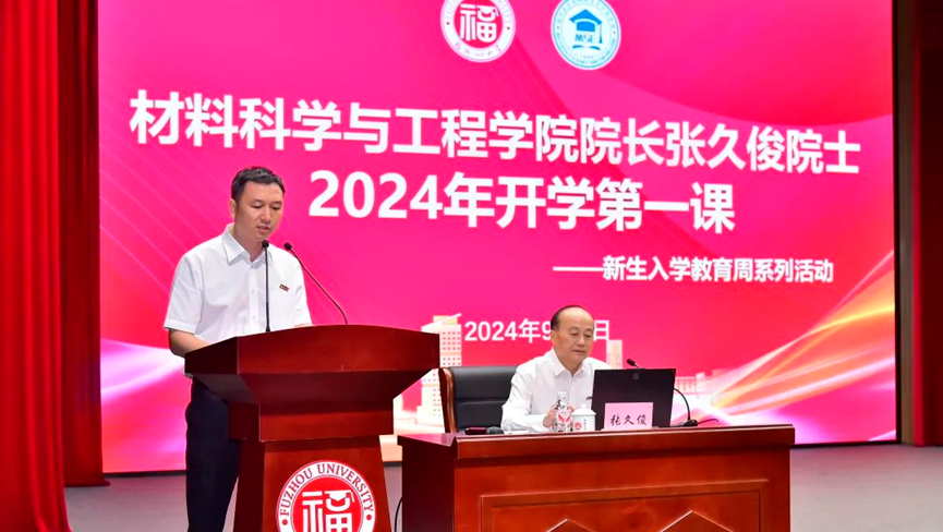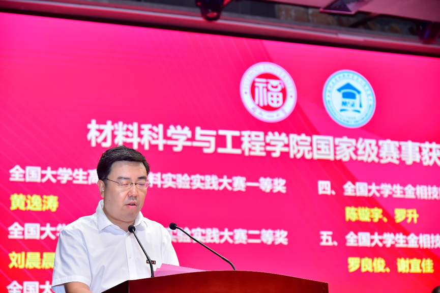 校友李巍博士发言,寄语新学期新同学,回顾了过去的校园岁月和学校的发展历程,表达了作为福大材料人的自豪之情,他勉励同学们要在新时代,掌握新工具,培养新能力,加强专业认同,探索未知的广阔领域,不负韶华,不负时代所托,奉献青春力量,助力社会主义现代化建设!