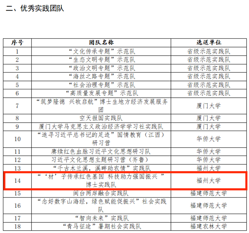 近日,据中共福建省委教育工委“追寻领袖足迹体悟伟大变革”2024年全省大学生暑期社会实践活动评选结果公示,成人影片 “‘材’子传承红色基因科技助力强国振兴”博士实践队获评"优秀实践团队"荣誉称号。