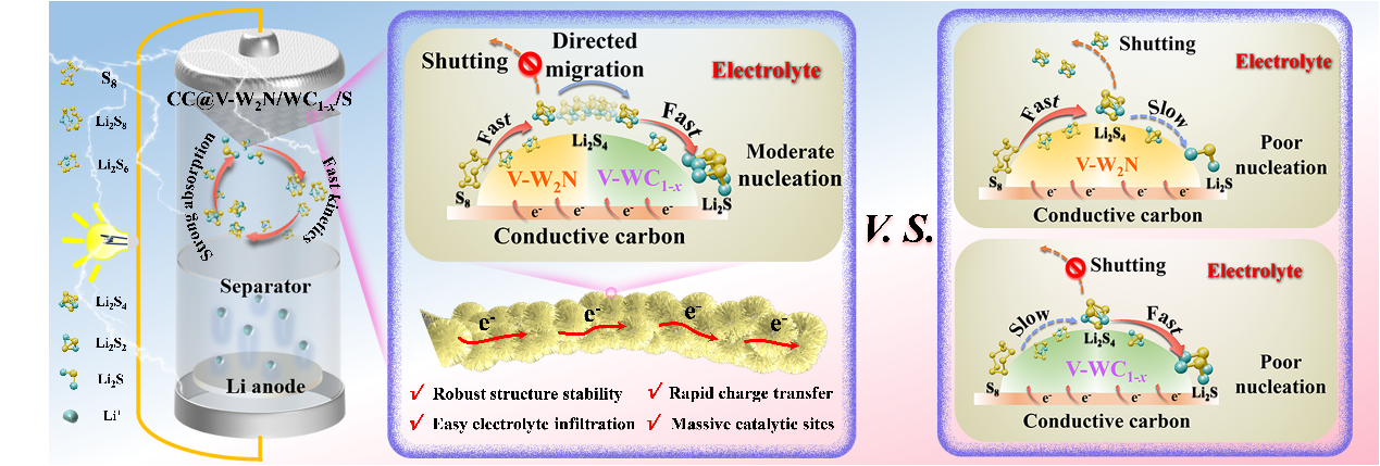 近日,成人影片 ,光电子材料与器件研究所在锂硫电池电催化剂的研究方面取得新进展,题为“Self-Supported Tungsten Nitride and Carbide Heterostructures with Vanadium Doping Tandemly Catalyze the Conversion of Polysulfides for Lithium-Sulfur Batteries”的文章发表在《Advanced Functional Materials》期刊上(影响因子18.5,中科院一区)。
