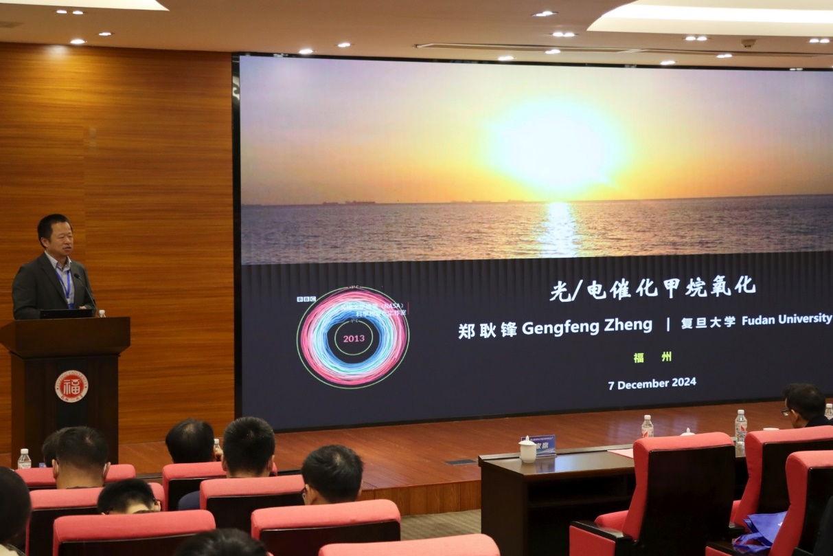 第四个报告来自国家杰出青年科学基金获得者、复旦大学郑耿锋教授。郑教授以“光催化甲烷氧化”为题,指出使用基于可再生能源的光催化,将CH4等碳基小分子转化为高附加值的产物储存,对实现碳中和目标具有重要的研究意义和应用前景。郑教授系统介绍了课题组近两年在水相体系中光催化甲烷氧化领域的研究,定向构筑协同活性位,并揭示了活性位点与反应路径的作用规律。