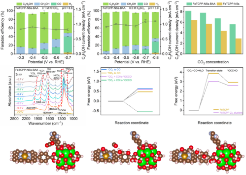 在构效关系方面,通过原位表征以及理论模拟的有效结合,该工作重点揭示了,有别于传统铜基催化体系中C-C偶联需要多个铜原子协同,该体系的C-C偶联过程为何能够发生在单个Fe中心,以及该体系为何不存在乙醇路径和乙烯路径的竞争。在该催化体系中,1H-苯并咪唑-5-羧酸和锆簇节点作为助催化中心分别起到富集二氧化碳以及协助构建氢键网络以降低二氧化碳加氢动力学的作用。而二氧化碳分子在铁卟啉的FeN4活性位点上活化生成斜式吸附的*CO中间体。相比于垂直吸附的*CO中间体,斜式吸附的*CO中间体在热力学上更倾向C-C偶联并参与后续加氢过程生成乙醇。同时。有别于传统铜基催化体系二氧化碳反应中间体偶联以及后续加氢在同一晶面多个位点上进行时,不同中间体吸附相互影响导致中间体吸附构型发生改变,造成不对称加氢与对称加氢同时发生,最终导致乙醇与乙烯同时生成。在该仿生催化体系下,中间体偶联以及后续加氢分别发生在催化中心和次级球助催化中心,两者通过非共价相互协同,彼此电子结构互不影响,导致C-C偶联中间体后续加氢仅生成乙醇。