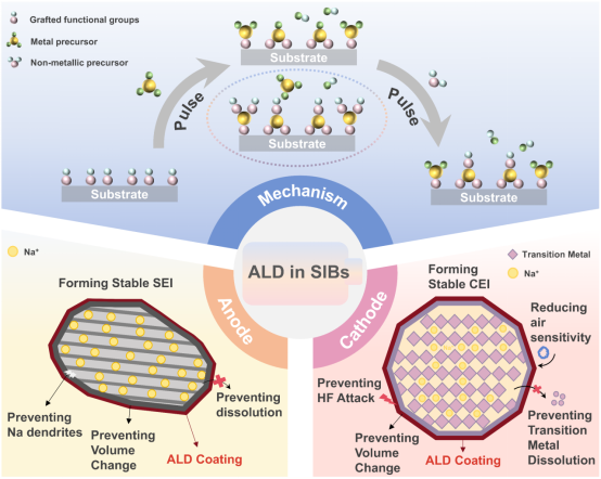 图1. 原子层沉积技术的基本工作原理及在钠离子电池中的作用