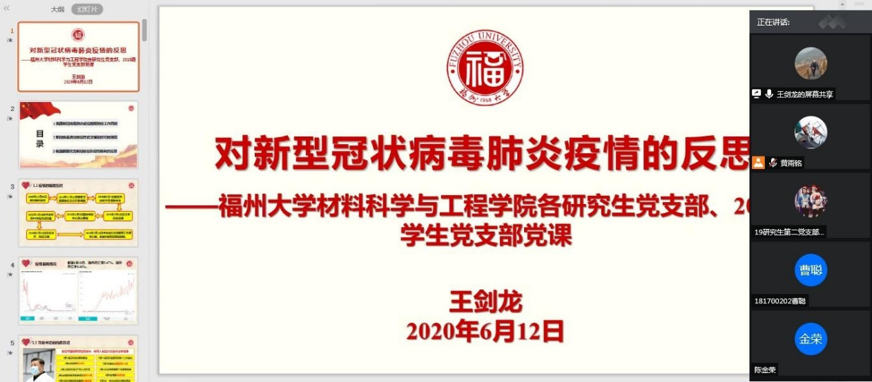 2020年6月19日下午,成人影片 成人影片 组织了以“对新型冠状病毒肺炎疫情的反思”为主题的专题党课,利用腾讯会议线上共享平台组织各研究生党支部、2018级学生党支部参与学习。