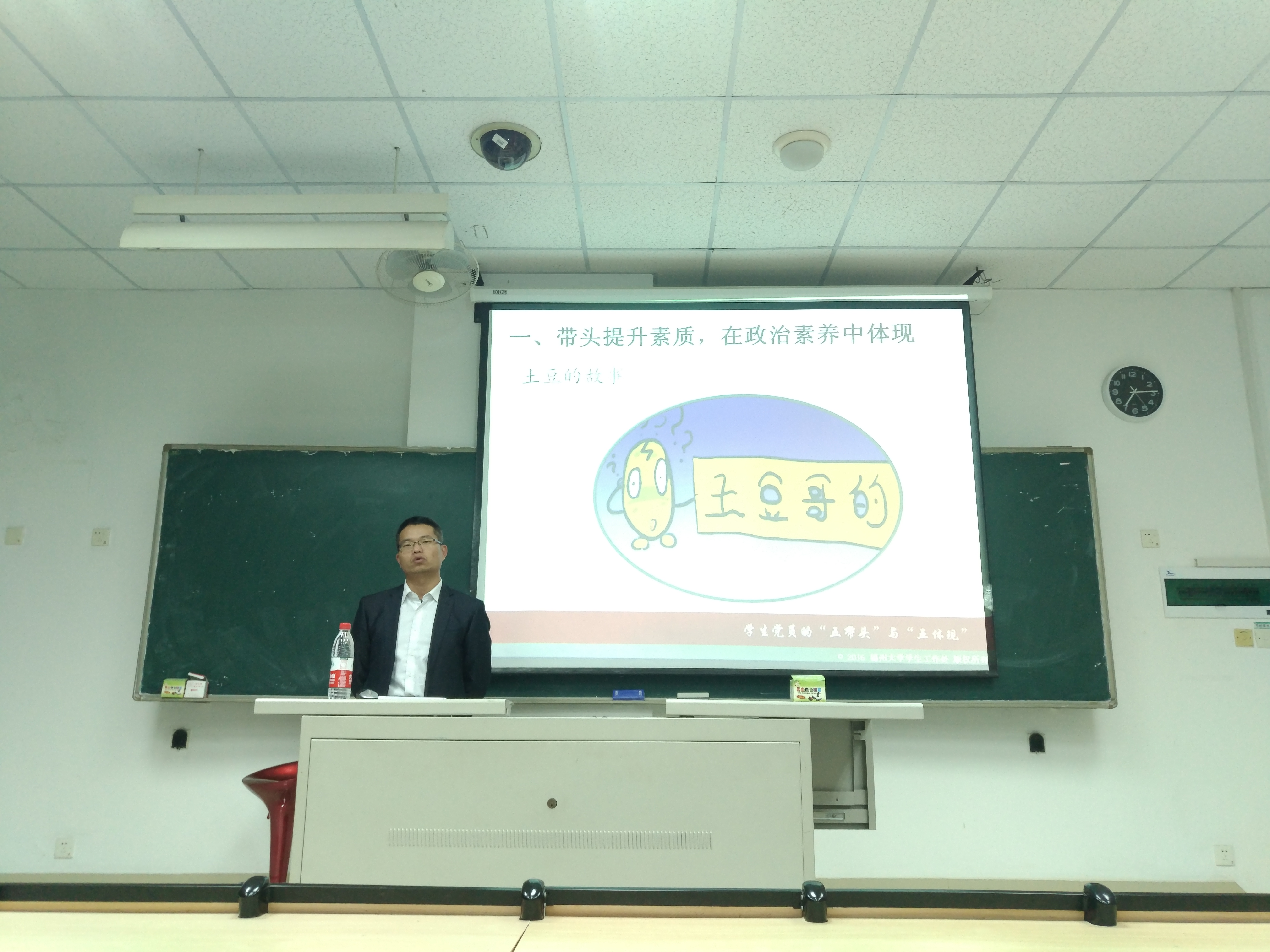 在岳志强老师简单的自我介绍后,党课正式开始。随后,岳老师介绍了此次党课的纲要:学生党员的“五带头”和“五体现”。分别是带头提升素质,在政治素养中体现;带头争创佳绩,在学习活动中体现;带头遵纪守法,在日常生活中体现;带头服务群众,在社会工作中体现;带头弘扬正气,在支部建设中体现。