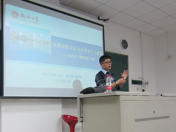 12月10日晚,成人影片 第十四期党课第二讲“优秀传统文化与大学生个人修养——以研读《菜根谭》为例”在西二208教室顺利举行。成人影片 学生工作处陈永福老师受邀担任本次党课主讲人。王文栋辅导员、廖烨檬辅导员以及第14期全体入党积极分子参与党课的听讲。