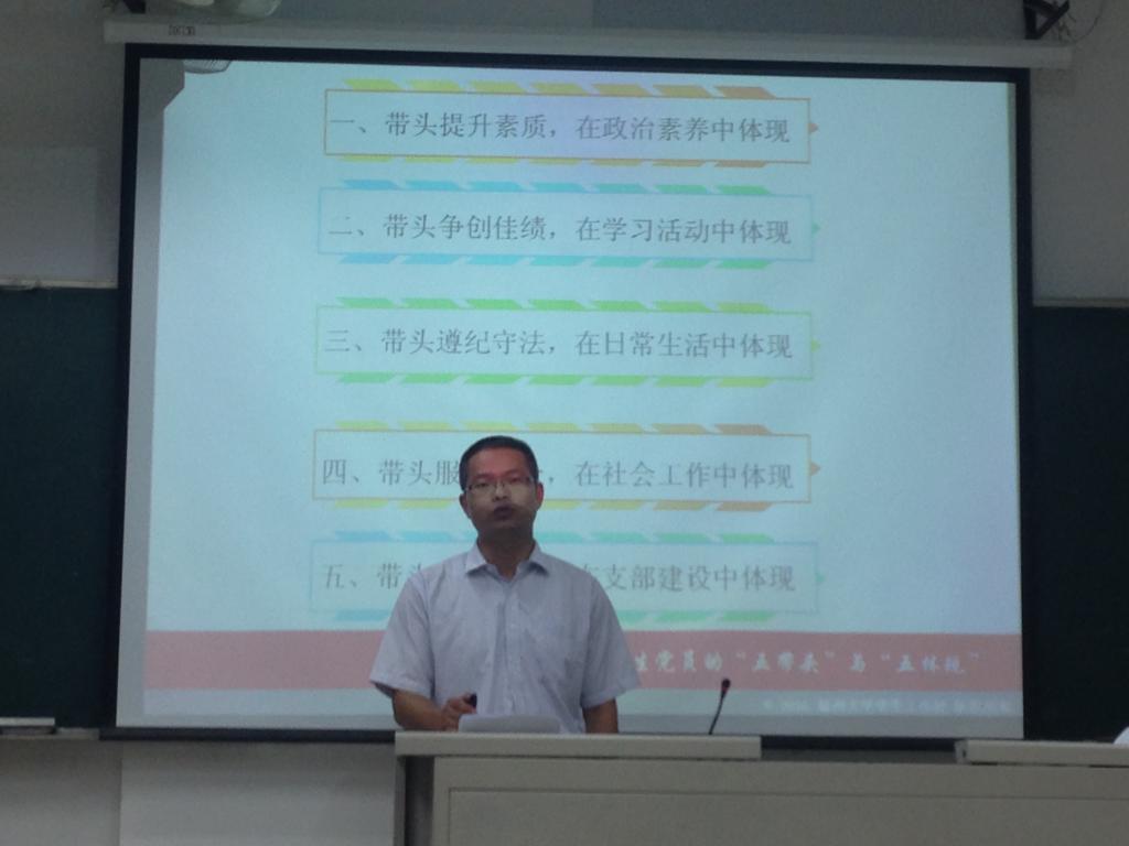 在简略自我介绍之后,岳老师直奔主题——学生党员的“五带头”与“五体现”:带头提升素质,在政治素养中体现;带头争创佳绩,在学习活动中体现;带头遵纪守法,在日常生活中体现;带头服务群众,在社会工作中体现;带头弘扬正气,在支部建设中体现。为让同学们更好理解主题,岳老师就我校的各类“门”事件等指出党员干部桥梁作用的重要性,学生党员要带头服务、帮助群众。岳老师就“宿舍吉尼斯”、“文明班级”等活动,建议学生党员要做到“三严三实”,弘扬正气,在支部建设中锻炼自己。他对全校的学情展开分析,指出学生党员带头争创佳绩的必要性,并建议党员干部要以身作则,主抓学习能力,提升理论水平;提高个人素质;落实爱岗敬业;带头遵纪守法。最后,岳老师指出积极分子有责任去以身作则.天下兴亡,我的责任,积极主动为同学服务。