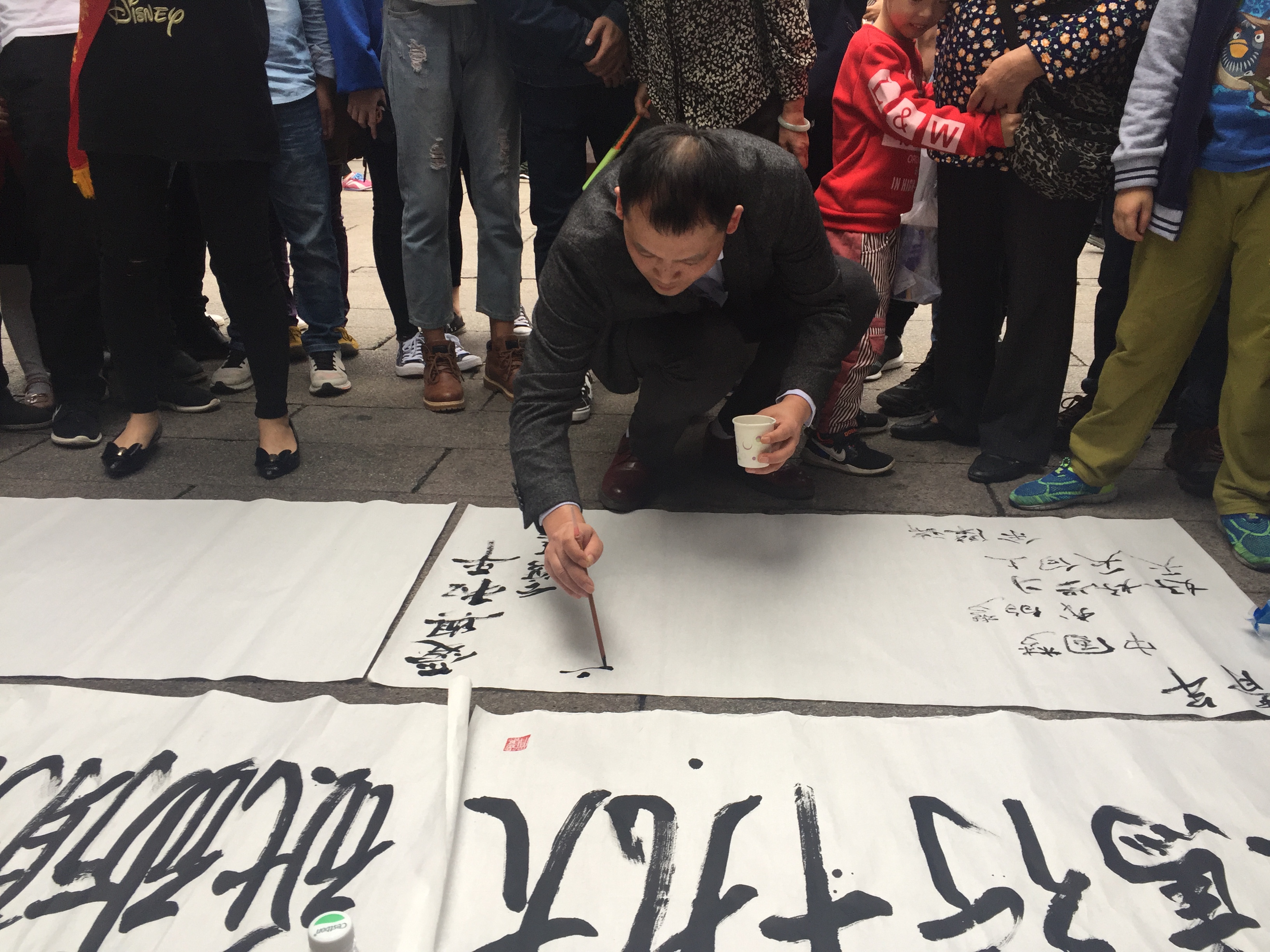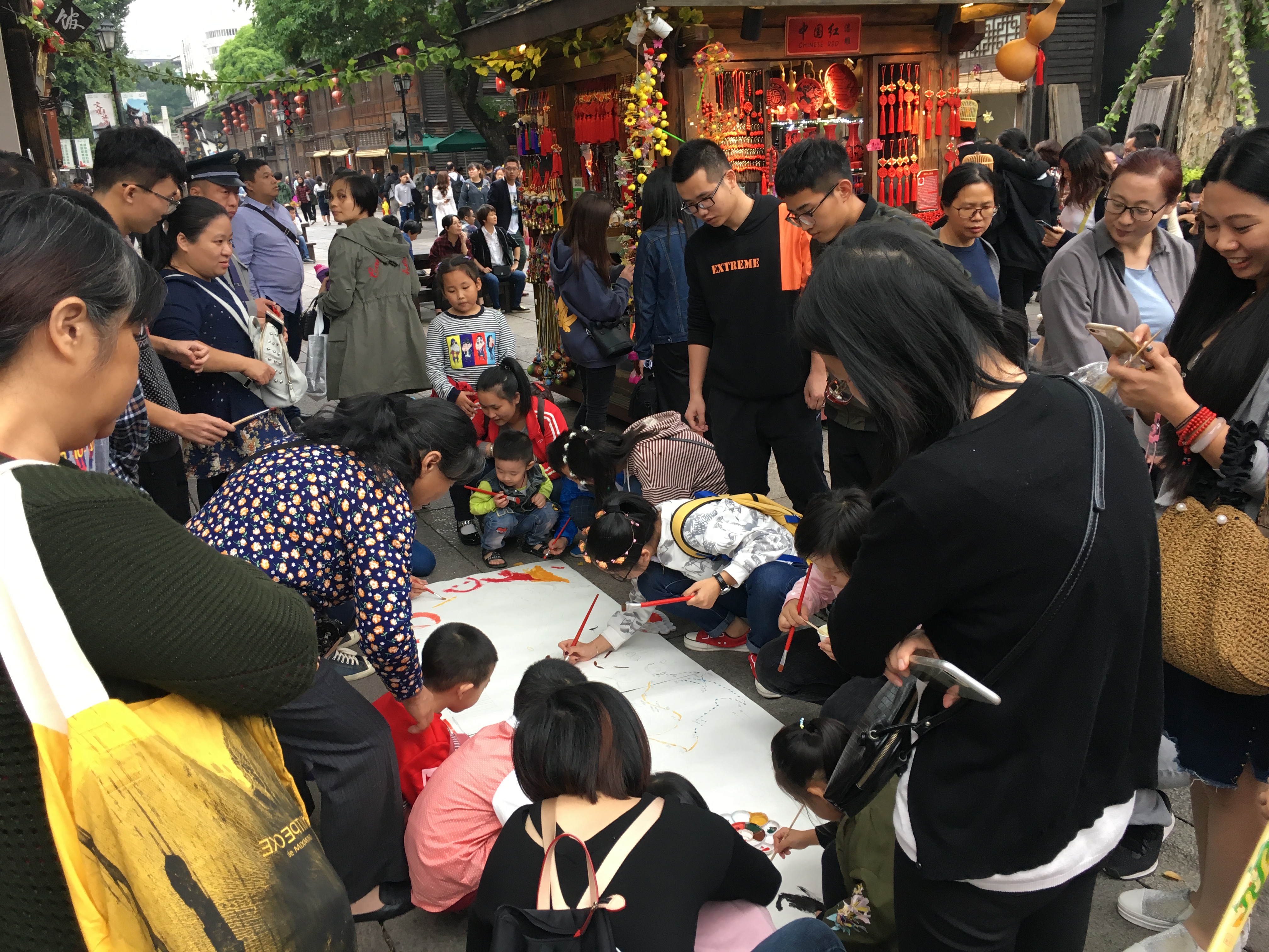 活动刚开始,涂鸦和书法立刻吸引了游客们,小孩、大人和老人们都热情参与。孩子们和大人通过画笔和颜料绘出十八大以来五年的中国非凡的成就,C919、中国高铁、一带一路……通过有趣的涂鸦和人员讲解形式,让孩子们了解党的十八大以来这5年所取得的历史性成就,学习十九大精神。老人们则通过毛笔书写出十九大精神,深化十九大精神。