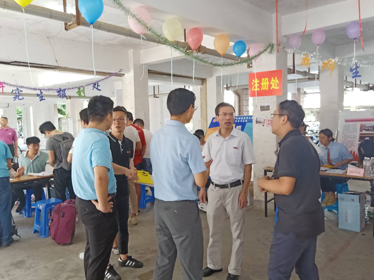 为了解注册报到点情况,指导迎新工作顺利开展,9月5日,成人影片 党委书记倪朝兴、副院长李凌云、党委副书记王剑龙、副院长兼19级3班班主任林枞、及院长助理陈俊锋来到迎新现场视察指导工作,慰问迎新工作人员,看望新生及家长。