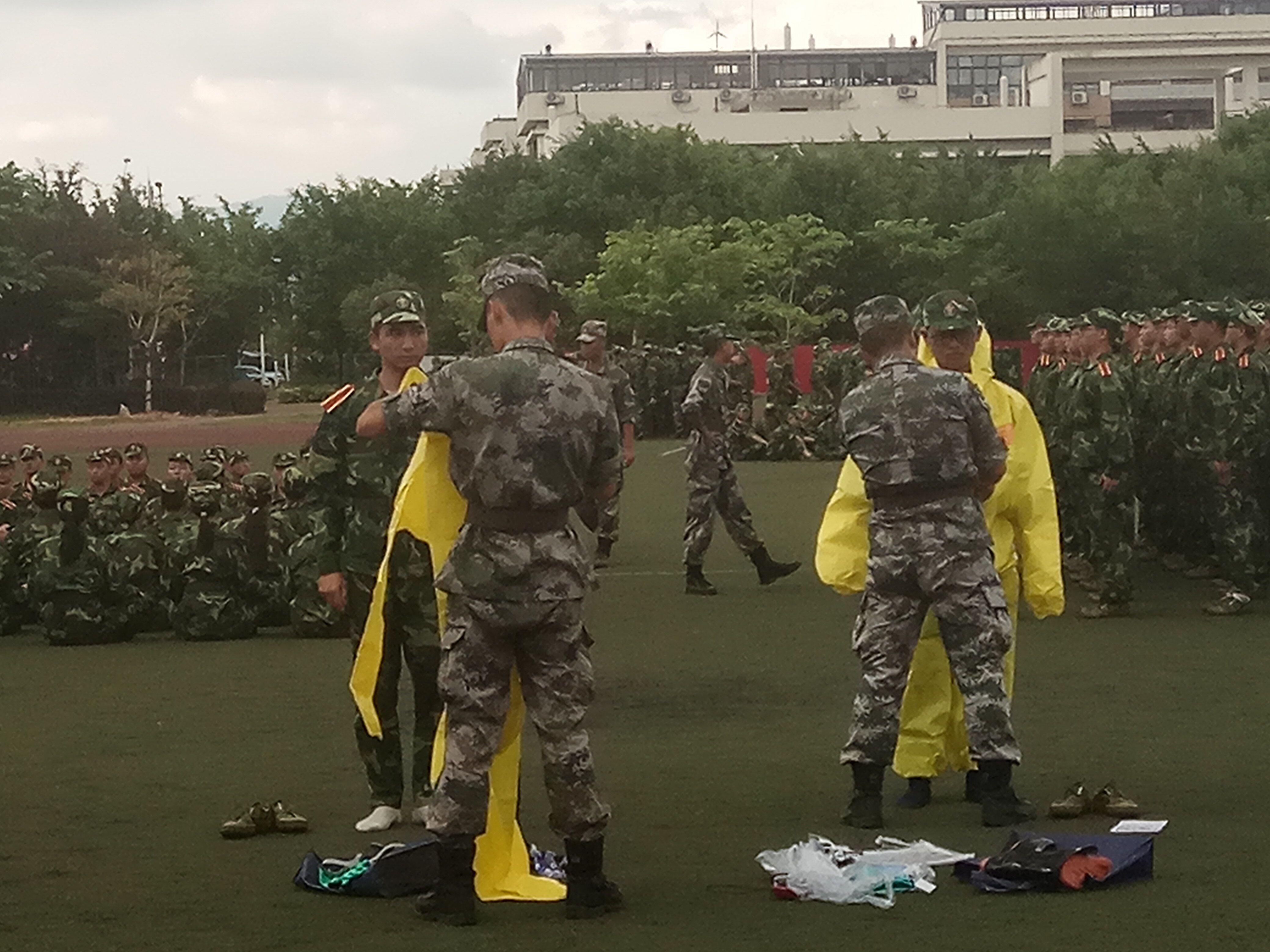 九月的福州依然炎热,新生们不畏艰难,在教官的教导下,认真地练习捕俘拳。王剑龙书记和王文栋老师时刻关注他们训练。等到新生休息时,王书记先是慰问了教官,对教官们多日训练新生的辛苦表示感谢,并送上中秋祝福。接着,王书记与新生们亲切交谈,对新生们的精彩表现表示赞扬,希望他们在之后的训练里能更加努力。他也时刻关注着身体不适的同学,希望他们能调养好身体、早日康复。之后,同学们开始了一个特殊的体验——使用“生化防护服”。亮黄色的“生化防护服”在绿色军训服中格外耀眼。教官们为同学们详细介绍了“生化防护服”的作用,并亲自为同学们穿上。同学们表示:“这次特殊的体验让我的使命感越发强烈。军训虽然苦,但是学到的东西非常多,很值得。”