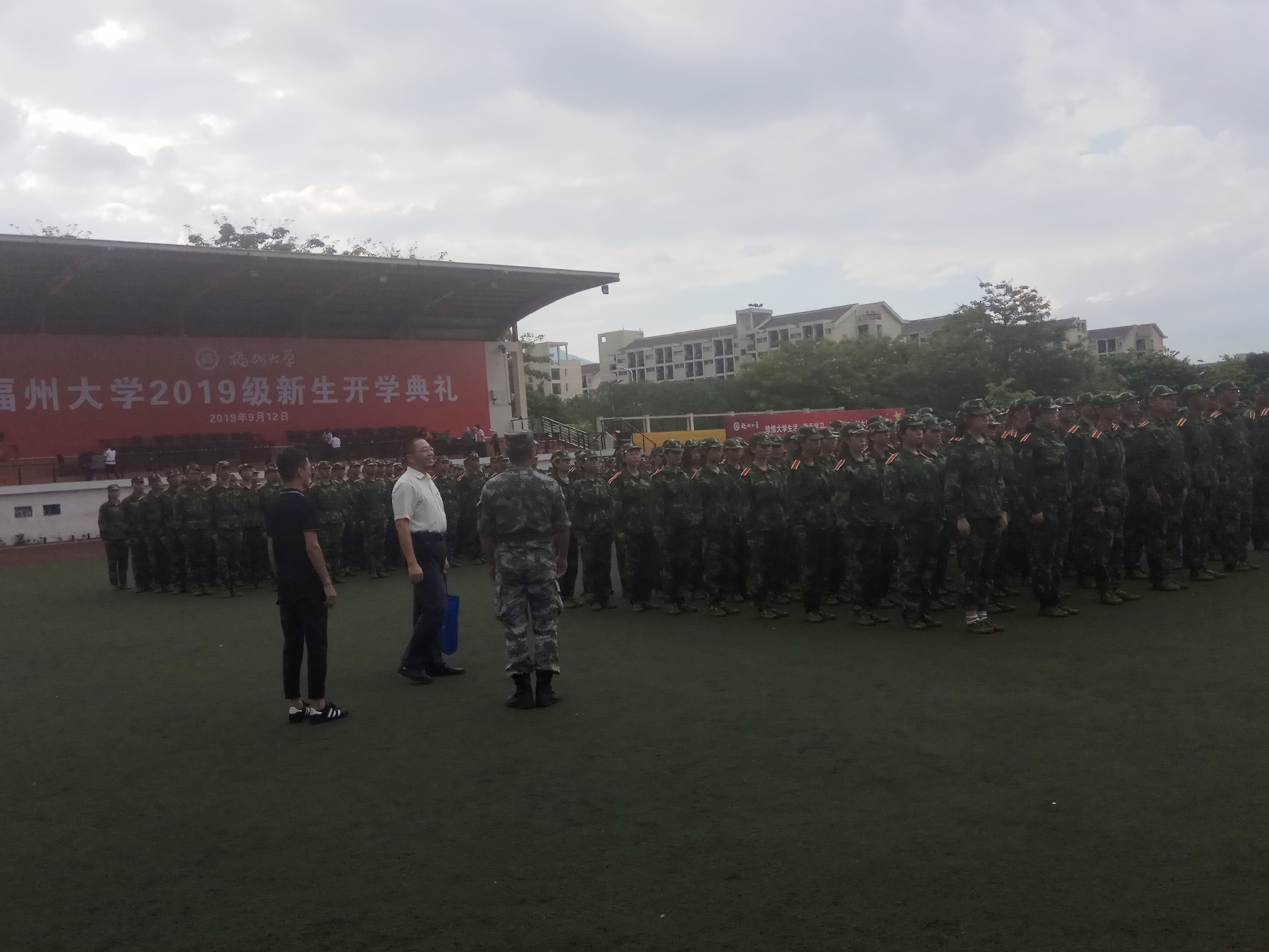 为了看望教官,了解19级新生军训情况,并慰问他们,9月1日下午,成人影片 党委副书记王剑龙和辅导员王文栋到生活一区操场了解军训情况。