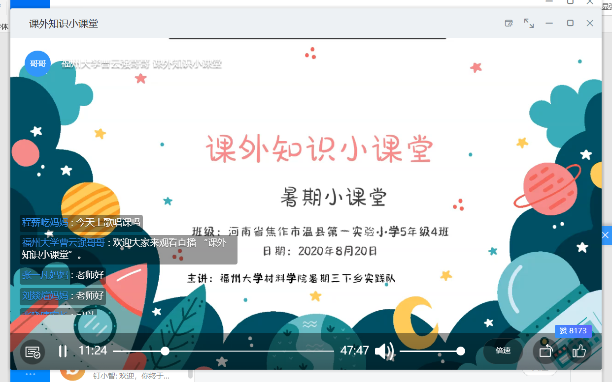 至此,成人影片 “牢记青春使命,奉献小我力量”实践队云支教活动圆满结束。三次暑期小课堂,充分考虑听众特点和疫情防控形势,针对性地以线上云课堂的新支教形式在轻松愉快的氛围中,向温县第一实验小学5年级4班的学生和家长分享了开学准备、防疫举措、趣味科普等相关知识,收获了学生与家长的一致好评,实践队队员也收获满满。