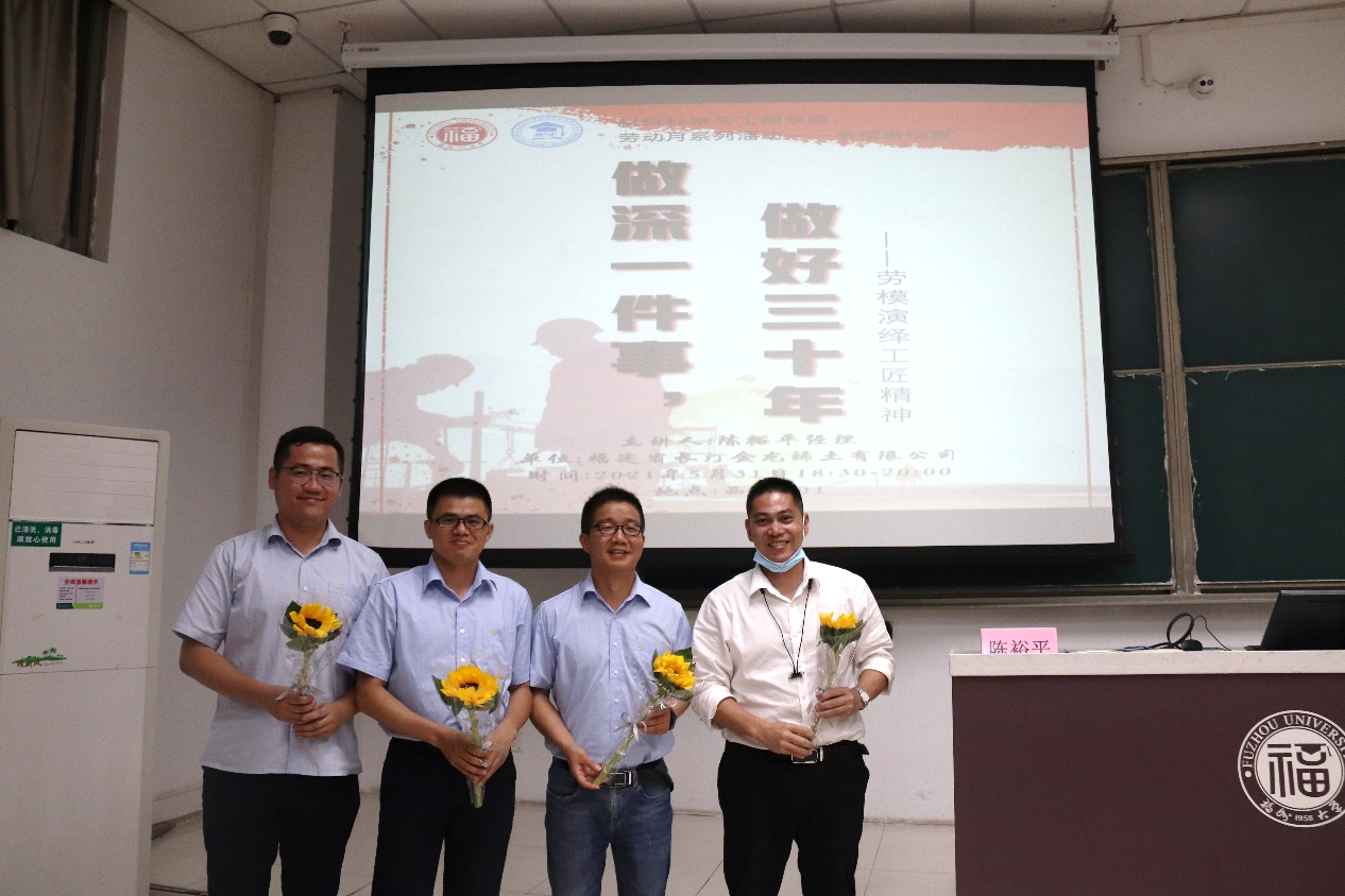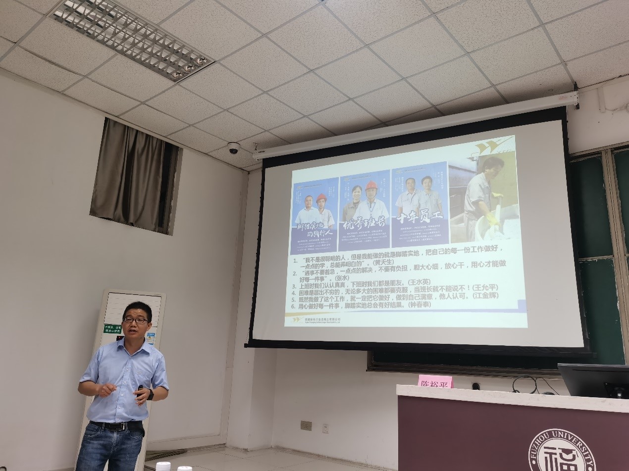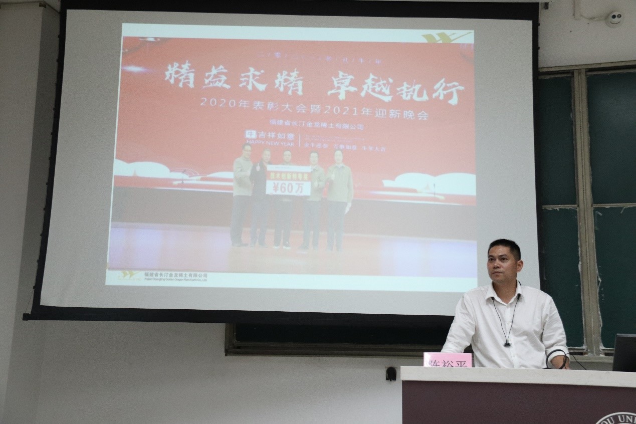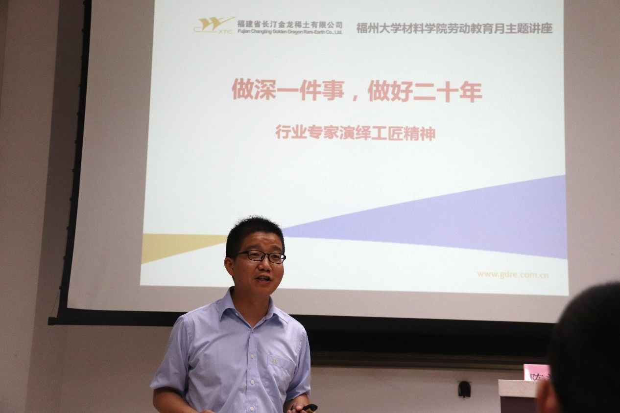 为培养成人影片 学子对于新时代劳动的认识、感受劳动的光荣、激励成人影片 学子培养新时代劳动技能,5月31日,福建省长汀金龙稀土有限公司陈余水总监、张榕贵经理、陈裕平经理、黄世华经理进一行人进校做劳模演绎工匠精神“做深一件事,做好二十年”主题讲座。讲座由陈裕平经理主讲,辅导员王怡老师及近百人参与活动。