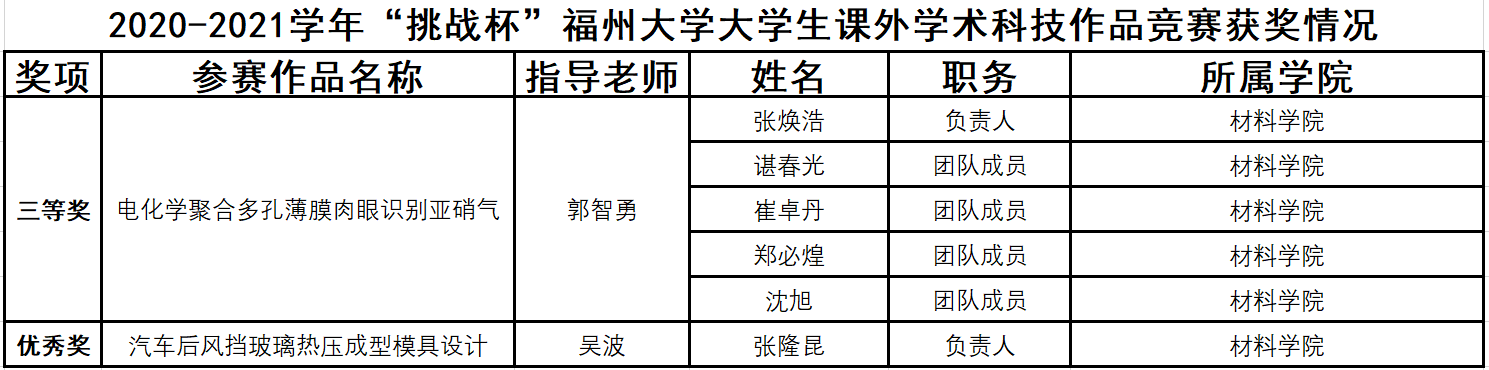 3日30日,2020-2021学年“挑战杯”成人影片 大学生课外学术科技作品竞赛顺利落幕,成人影片 师生参与的项目共获得三等奖1项、优秀奖1项的佳绩!在此,对获奖团队所取得的优异成绩表示衷心的祝贺!