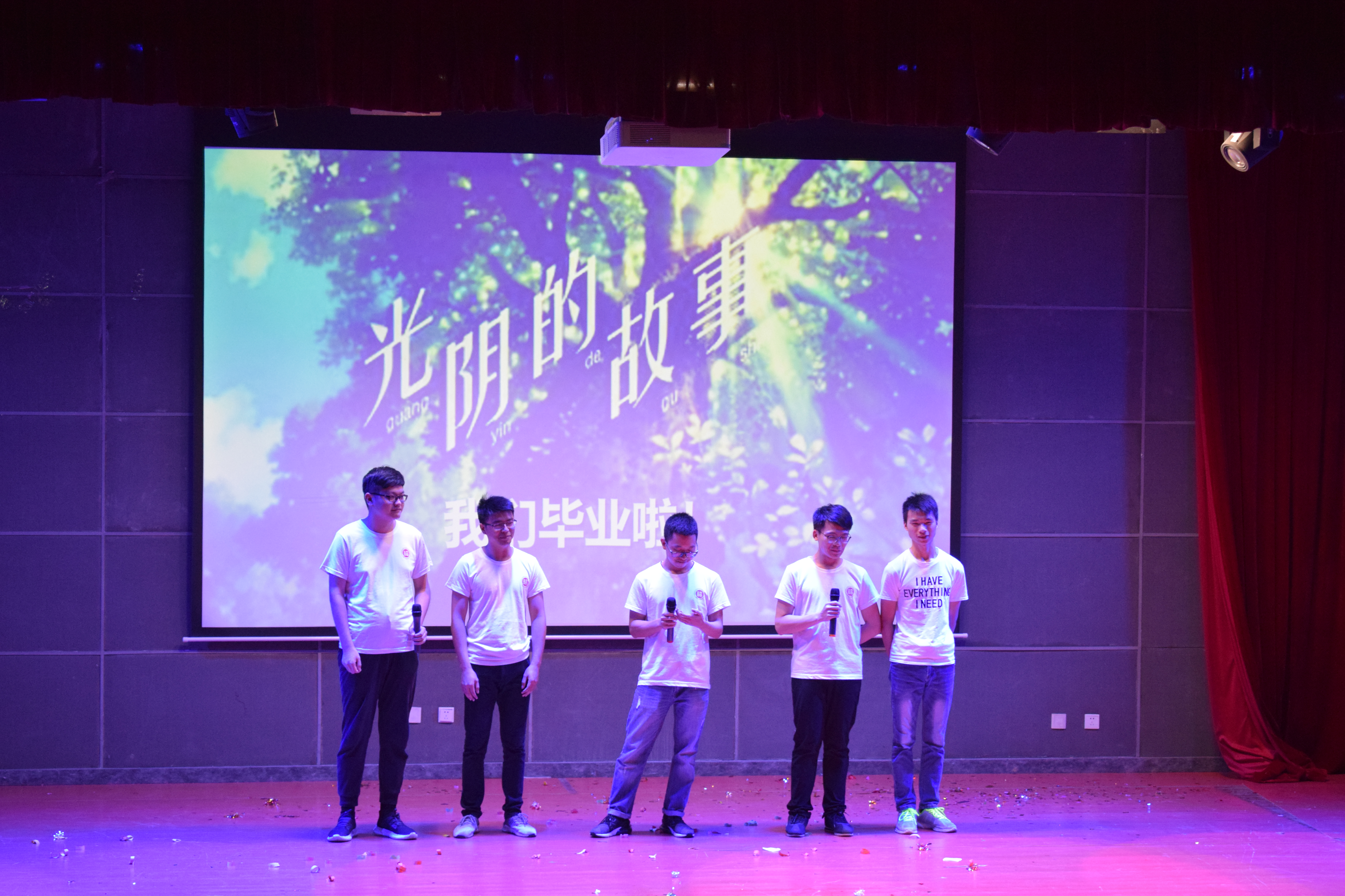 晚会伊始,DBL酷炫舞蹈瞬间点燃现场的气氛,主持人在观众的掌声中闪亮登场,晚会正式拉开序幕。舞台上,表演者纷纷惊艳亮相,大四学长杜翼雄带来的《lost stars》和成人影片 歌手队的带来的歌曲串烧翻起大家许多甜甜的青春回忆。合唱歌曲《我的梦》及研三的袭晟堃同学带来的《带你去旅行》让人青春思绪飞扬。紧接着是18级二班幕布情景剧《致青春》,生动精彩、别具一格。随后,开始晚会互动“一心多用”游戏环节——跳绳答数学题,该环节让全场气氛达到高潮。晚会后半场,17级同学代表演唱歌曲《再见》引人热泪,礼模队《大学那些事》帅气出场,小品《毕业后》、合唱歌曲《送别》及大四的班委团共同准备的《光阴的故事》回忆大学时光,憧憬着未来的生活。