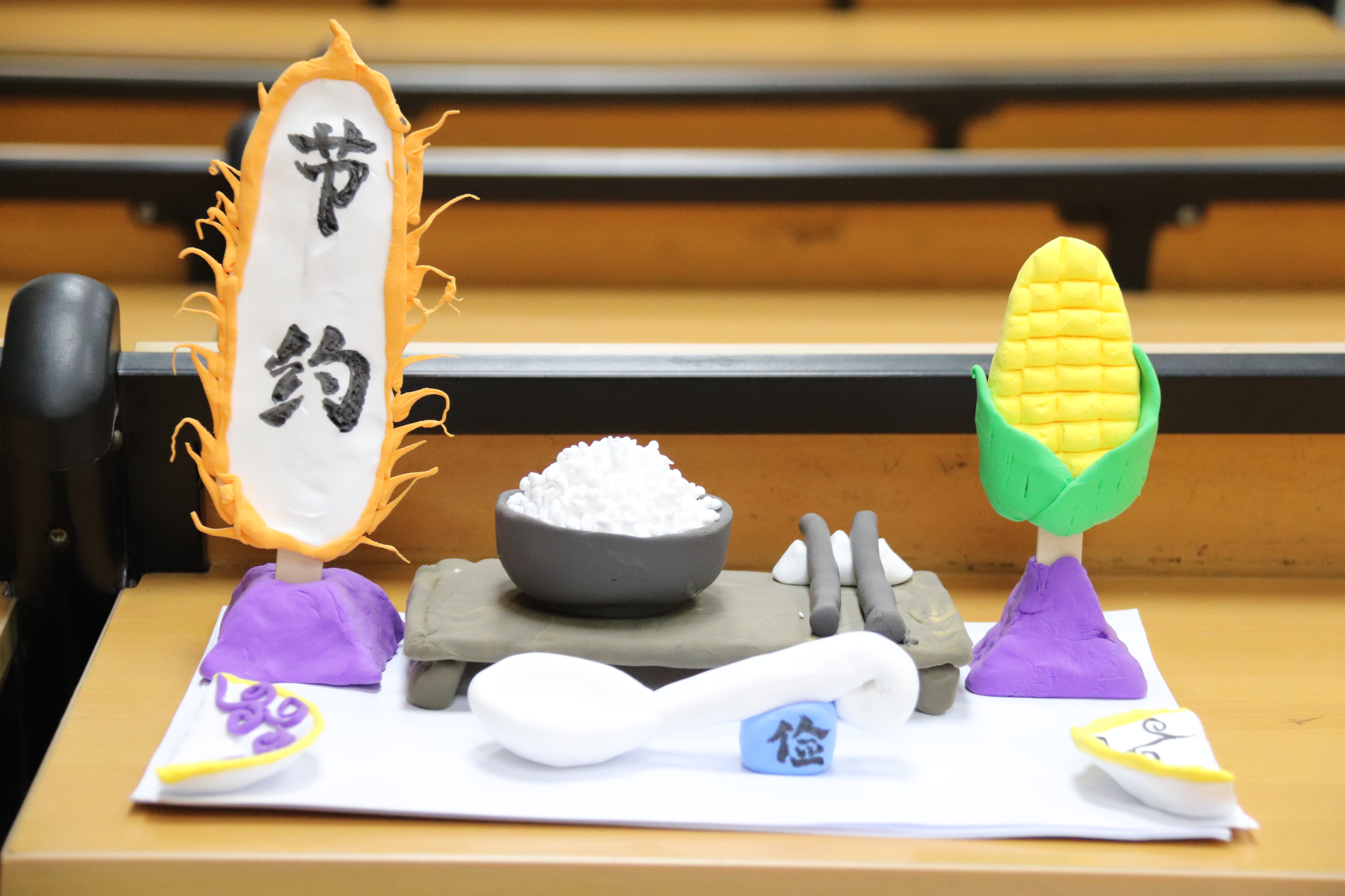 在此次活动中,许多同学积极参与,三人为一支队伍,利用软陶和超轻粘土制作活动作品。同学们根据各自对勤俭节约的理解,综合意见,发挥自己的动手能力,将自己对勤俭节约理念的认识融汇于一个个栩栩如生的作品之中。这些作品不仅体现了陶艺的精致与美观,更体现了同学们深入贯彻坚决制止餐饮浪费理念的决心。每支队伍都非常地用心制作着自己的作品,有同学表示,希望自己的作品能被更多的人看到,传播勤俭节约思想。