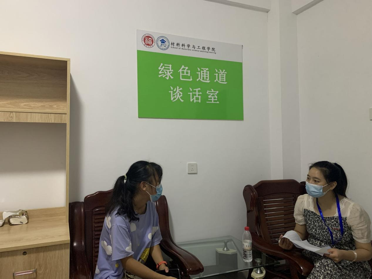 在“绿色通道”内,辅导员张丽芬老师与学生干部及志愿者们与家庭经济困难学生进行了详细交谈。就新生的基本信息展开,深入且详细了解其家庭组成情况、收支情况、负债情况等各类信息,在详尽记录的同时给予新生以足够的理解与关怀,在介绍具体政策的基础上为新生提出切实建议。