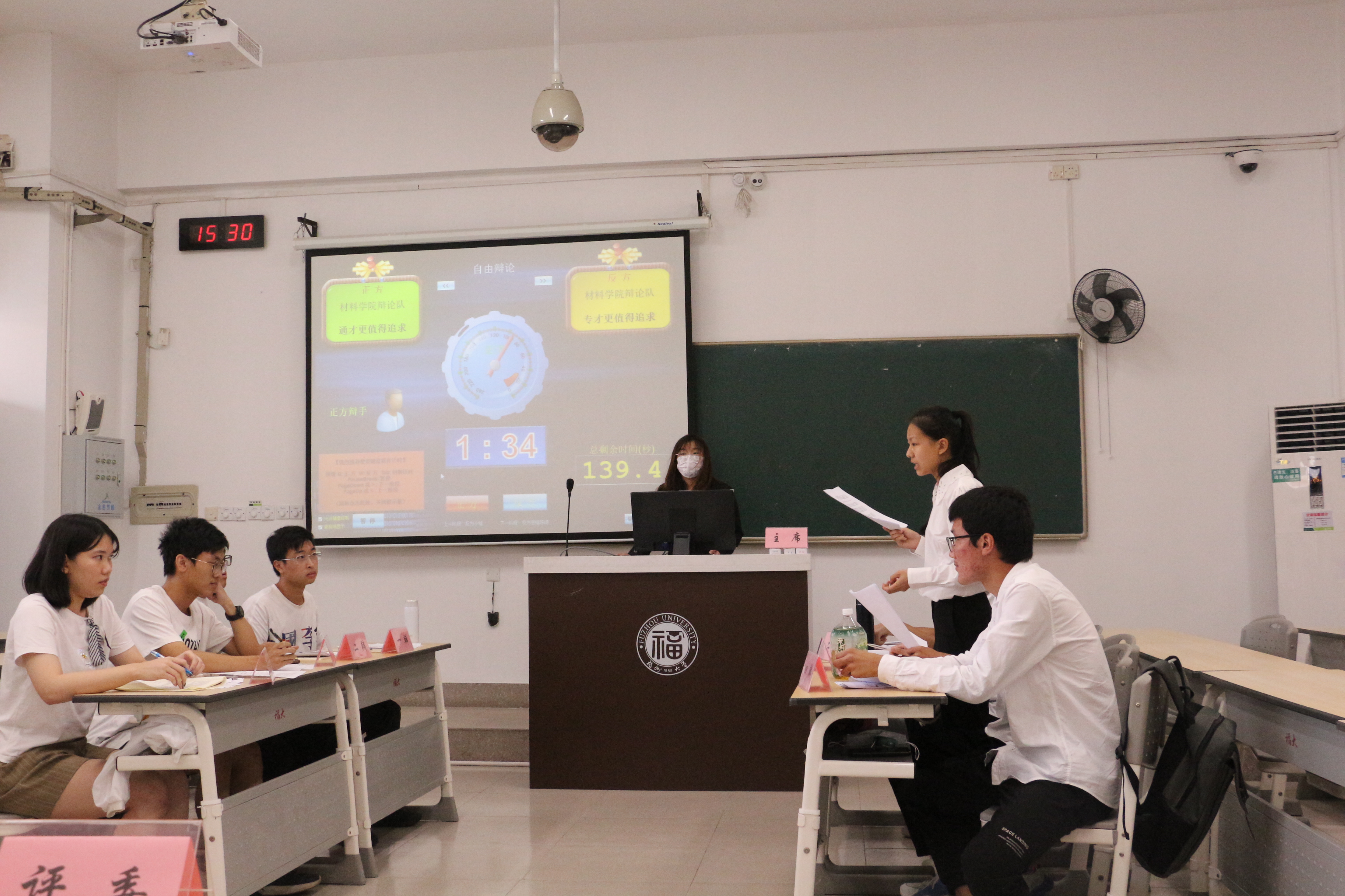 评委及学生依次入座后,比赛主席讲明规则,比赛随即正式开始。比赛伊始,在正反双方铿锵有力的开篇立论后,双方进行了精彩的质询环节。进入自由辩论环节后,观点的碰撞尽显双方辩手思维的敏捷,紧张与刺激的气氛感染着每位观众,推动此次比赛走向高潮,双方旗鼓相当,力争上游,一决雌雄。最终比赛由反方以4:5的成绩险胜,反方四辩邢瑄桐同学获得最佳辩手。