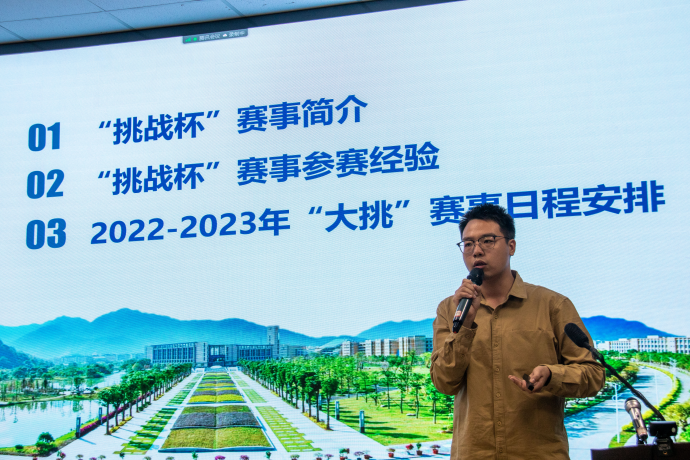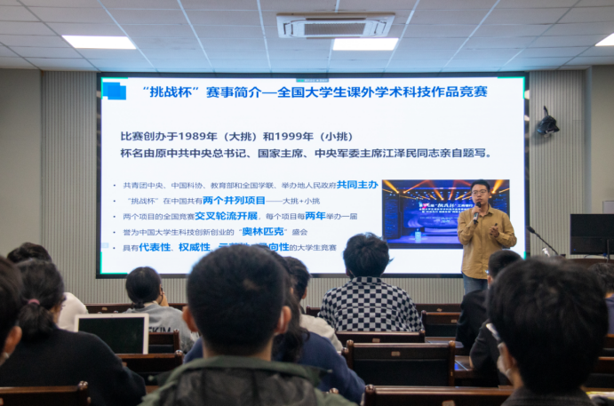 活动中,谢俊慧老师详细地向同学们介绍了“挑战杯”竞赛的发展历程、主要赛道及赛程安排等。