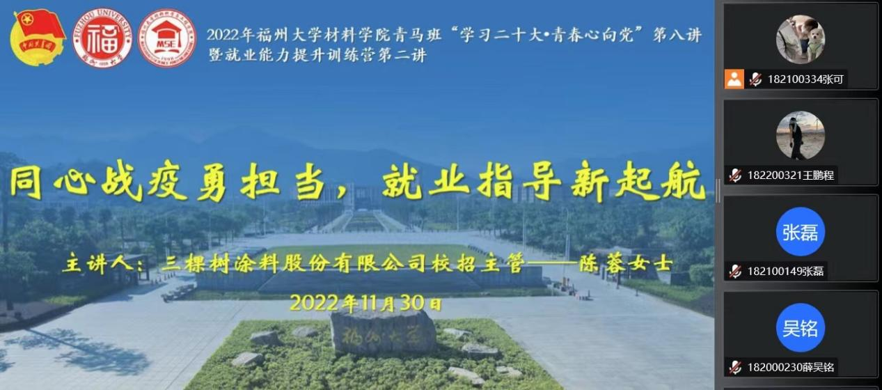为帮助同学们了解材料相关企业发展行情,树立学习目标以及未来发展方向,11月30日,成人影片 开展了以“同心战疫勇担当,就业指导新起航”为主题的青马班“学习二十大,青春心向党”第八讲暨就业能力提升训练营第二讲活动。