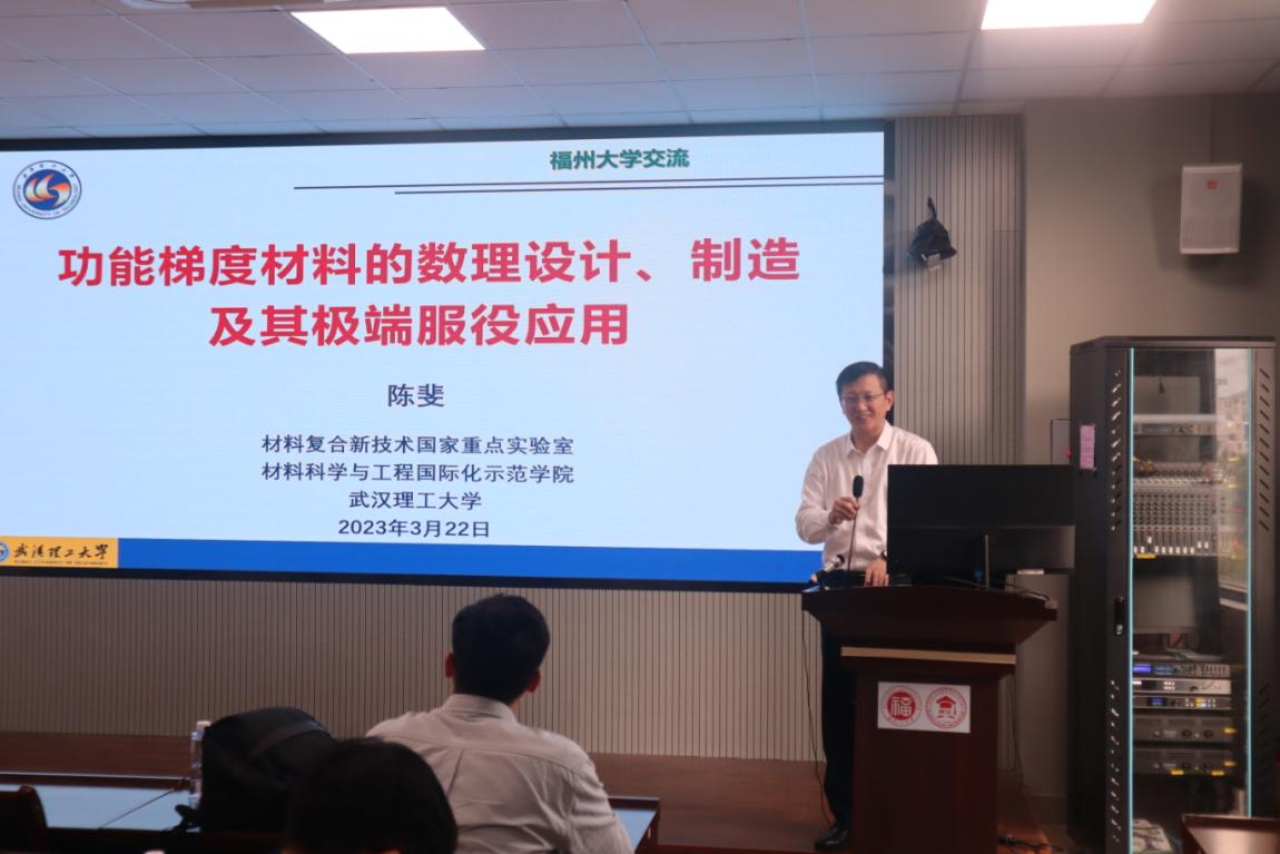 2023年3月22日下午15:30,应成人影片 的邀请,武汉理工大学材料复合新技术国家重点实验室、材料科学与工程国际化示范学院陈斐教授莅临成人影片 进行交流,并为成人影片 师生带来了一场题为“功能梯度材料的数理设计、制造及其极端服役应用”的精彩学术报告。报告会由成人影片 罗中箴教授主持,学院师生近一百人参加了本次报告会。