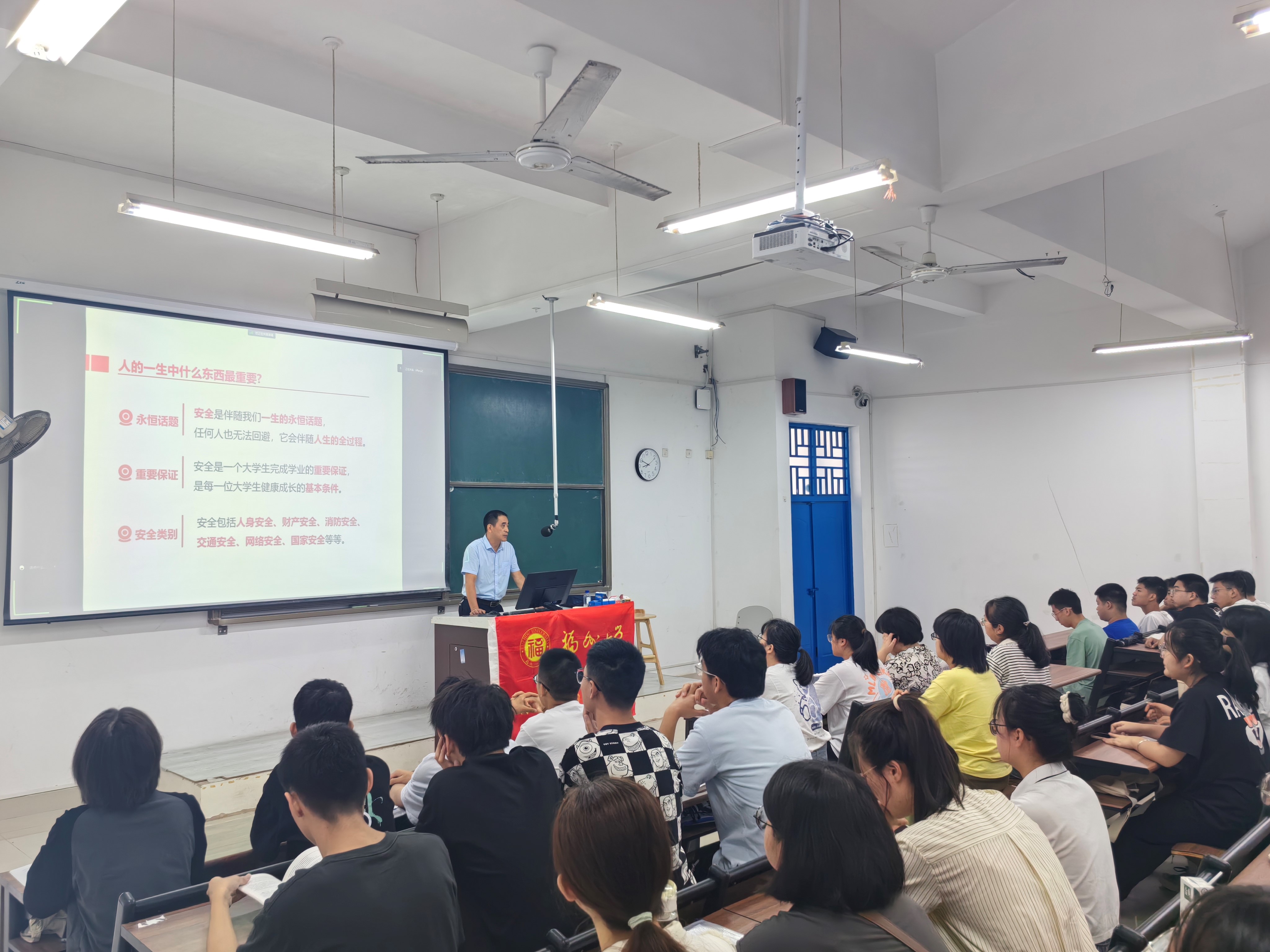 为进一步学习宣传习近平新时代中国特色社会主义思想,贯彻落实安全观,增强2023级全院新生安全意识和素养,深化平安校园建设。8月31日晚,成人影片 邀请校保卫处安全教育科彭桂平老师为2023级新生开展新生安全教育专题讲座,本次活动由新生辅导员张婷老师主持,全体2023级新生参加了本次讲座。