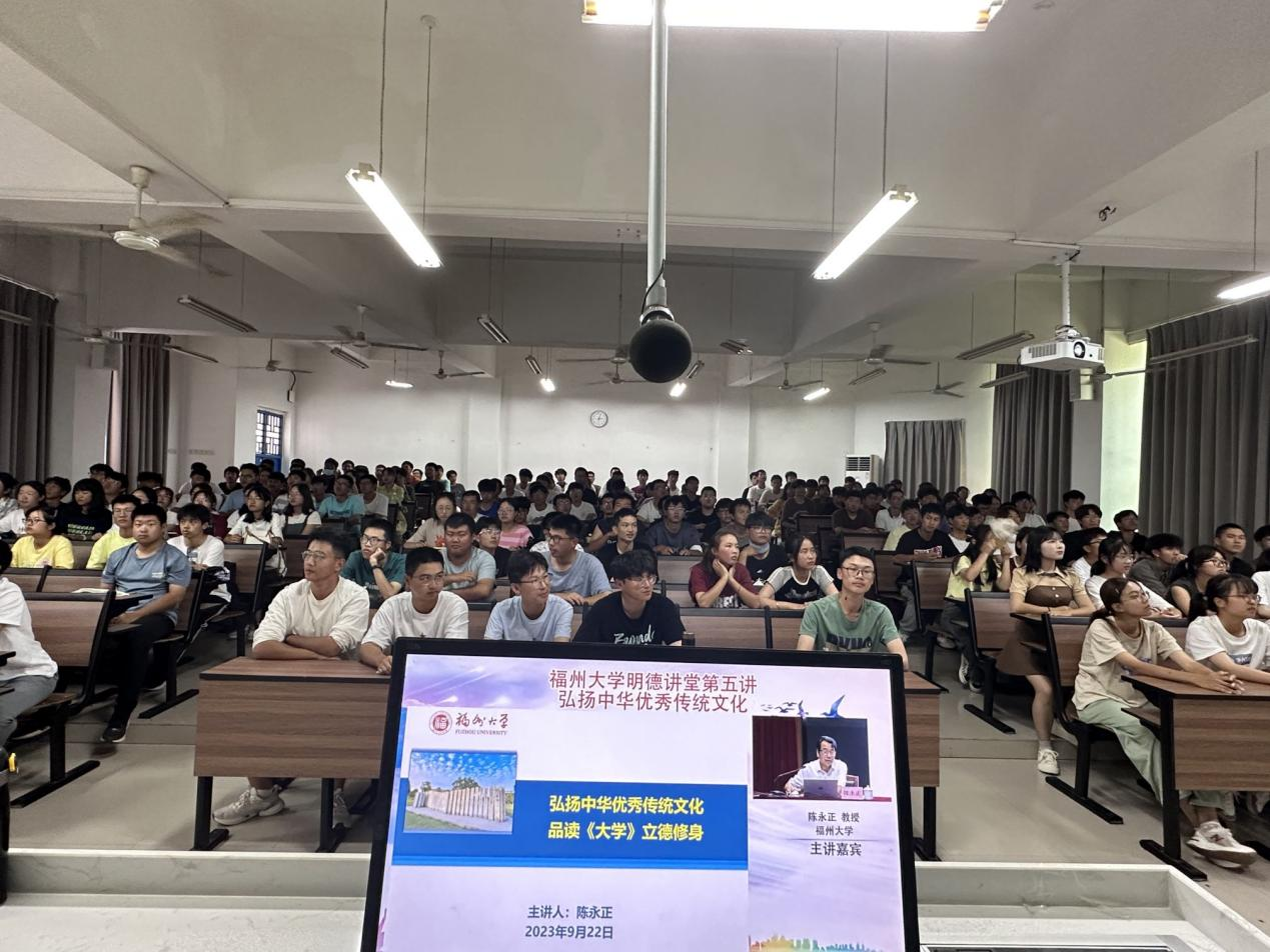 陈永正教授为我们做了让人印象深刻的讲座——“弘扬中华优秀传统文化,品读《大学》,立德树人”。中华文化的博大精深使我颇有感触。陈教授讲述的中华优秀传统文化的起源及涵盖内容让我们认识到了她的“骨骼”“血肉”。她延续着我们国家和民族的精神血脉,既需要薪火相传、代代守护,也需要与时俱进、推陈出新。源自于《大学》和《论语》的福大校训“明德至诚,博学远志”就是传承中华文化的典范。作为当代青年,我们更要深化对中华优秀传统文化重要性的认识,不忘本来、吸收外来、面向未来,推动实现中华文化的现代化。在陈教授的讲授下,中华优秀传统文化的魅力展示地淋漓尽致,让我们携手弘扬中华文化,争做新时代新青年。