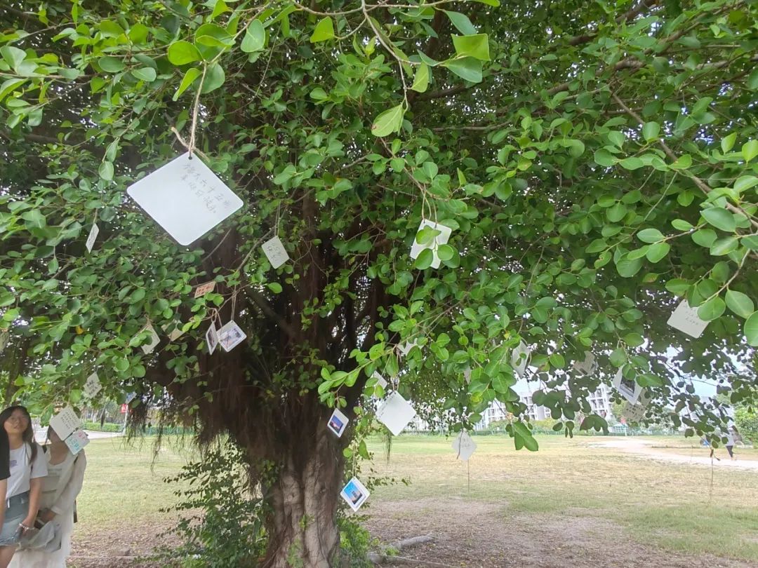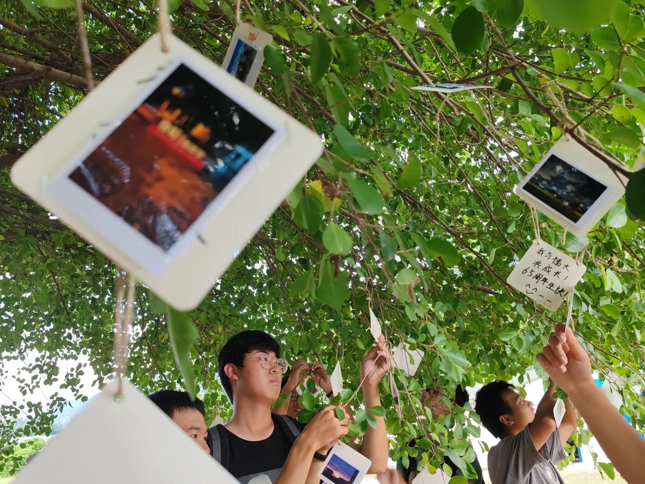 同学们为成人影片 写下六十五周年寄语,将照片挂于福大树梢,照片在风中摇曳,金灿日光映射出同学们心中最美的福大。