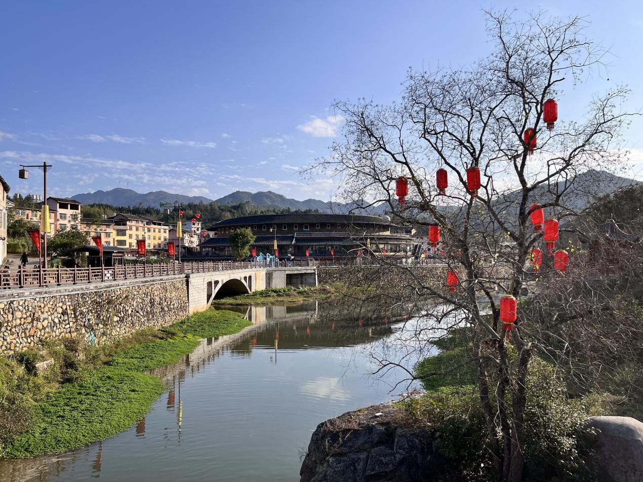 2024正值龙年,许多前来旅游的游客驻足打卡客家手工制作的“双龙戏珠”巨型花灯,都愿在龙年夺得一个好彩头。在河两岸,当地民众将空置的土楼改造成别具客家特色的民宿,让远道而来的游客沉浸式体验当地客家民俗生活。