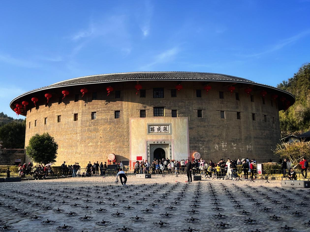 到了夜晚景区灯光秀时间,无人机点亮了永定土楼景区的夜空,百十架发光无人机在空中形成各种以龙年和土楼为主题的图案,吸引了众多本地或外地的游客前来观赏,几台激光投影仪将振成楼当成一块大银幕,向游人展示了客家人南迁的历史以及土楼的制造工艺。