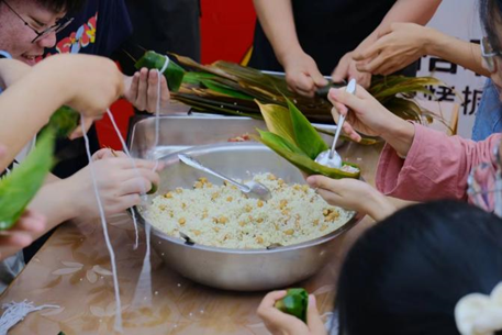 活动当天,食堂的工作人员提前为同学们准备好了糯米、粽叶、豆沙等一系列包粽子所需材料,并为同学们详细讲解、示范了包粽子的要点与诀窍,包括粽叶的选择与裁剪、捆线的手法等。学会要领后,同学们分工合作、齐心协力,一片片粽叶在手中飞舞,一卷一叠,装米、填料、捆线,一个个诱人的粽子就做好了,整个活动现场弥漫着棕叶香,大家看着手中自己亲手包好的粽子,幸福纷纷洋溢在脸上。