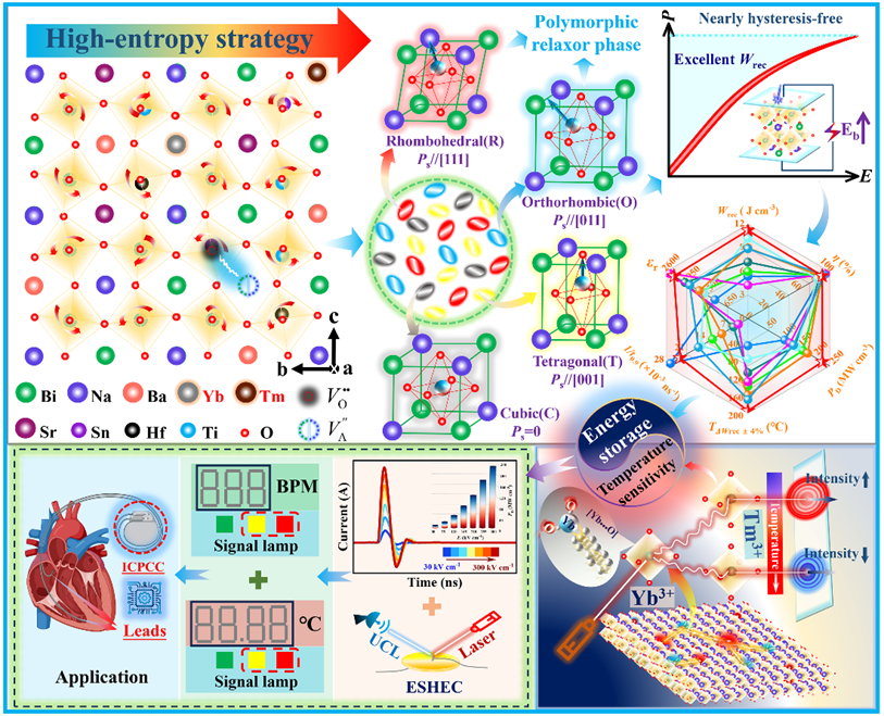 本研究通过协同优化ABO3钙钛矿结构的A/B位点,构建高熵组分设计策略,成功开发出具有缺陷偶极子极化与多晶型弛豫相(R-O-T-C)共存的纳米结构钛酸铋钠基高熵陶瓷。该材料展现出优异的储能性能,兼具高可逆储能密度(6.2 J/cm³)与超高效能(92%),突破了传统电介质材料的性能瓶颈。通过双稀土Yb³+/Tm³+共掺杂策略,同步实现了荧光负热膨胀效应与温度响应特性,赋予电介质电容器原位温度传感功能。研究进一步提出该材料在智能心脏除颤脉冲系统的应用前景,其快速放电特性(响应时间<50 ns)与温度自监测能力,为AI远程云医疗系统的搭建提供了一种极具竞争力的新型电容材料。