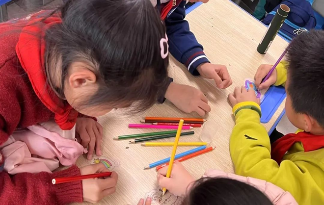 在课堂中,志愿者精心设计了热缩片手工坊和彩带粉笔实验两大环节。孩子们在热缩片制作环节展现出极大的创作热情。他们首先从数十种图案模板中选出喜欢的样式,用彩笔勾勒出轮廓并填色,再沿边线剪裁成所需形状,完成打孔等前期处理。