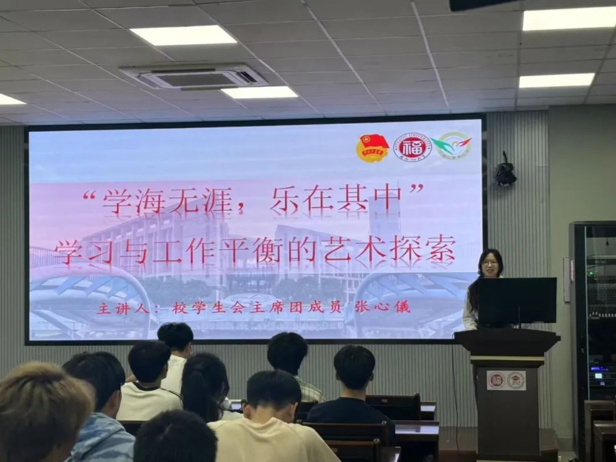 张心儀以《“学海无涯,乐在其中”学习与工作平衡的艺术探索》为主题从课程成绩、四六级高分攻略、学生工作,三个部分展开。张心儀学姐分享了自己的学习经验与课程笔记并从四个步骤分享了四六级高分攻略与背单词软件、英语视频等。最后张心儀学姐进行了工作心得的分享,重点强调了活动照片的拍摄流程与细节要求。
