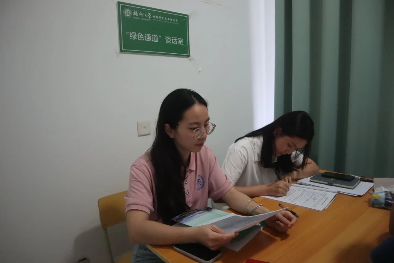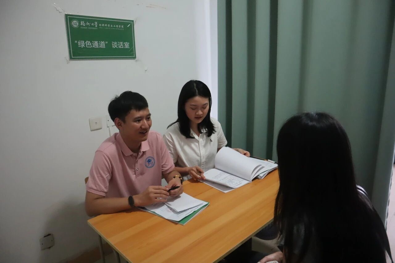 为切实保障有需求的新生无忧入学,学院在52号楼专门设置 “绿色通道” 谈话室。张庭士老师、肖凯尹老师和汪逸宁老师与新生面对面交流,细致了解其实际情况与诉求,切实解决其后顾之忧,确保迎新工作暖心又高效。